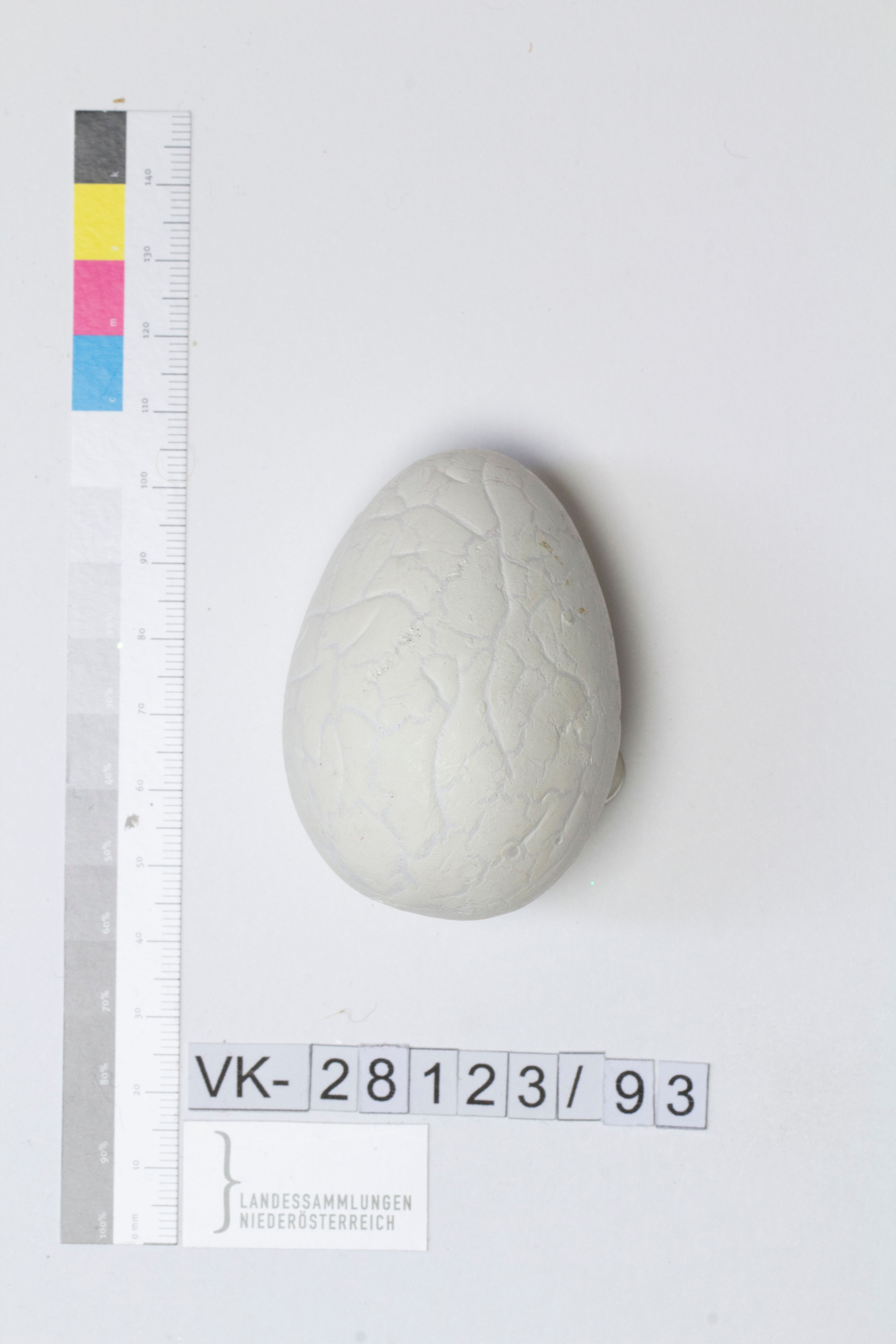 Zementei = Betonei, weiß, gegossen, Musterung: Krakele; Bändchen: fehlt = ausgerissen