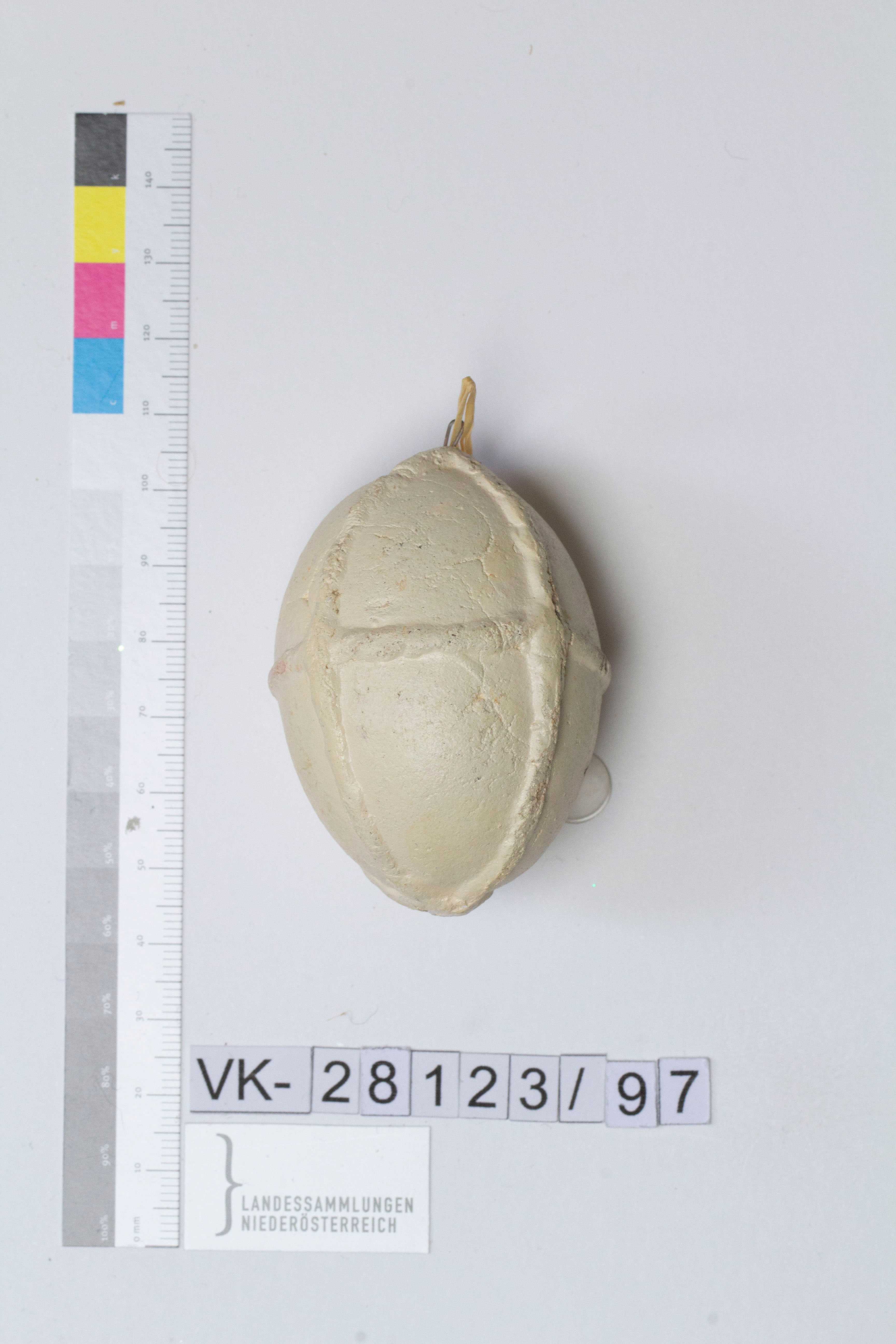 Zementei, weiß, gegossen, Musterung: je 1 Quer - und Längswulst; Bändchen: Bast Metallschlaufe