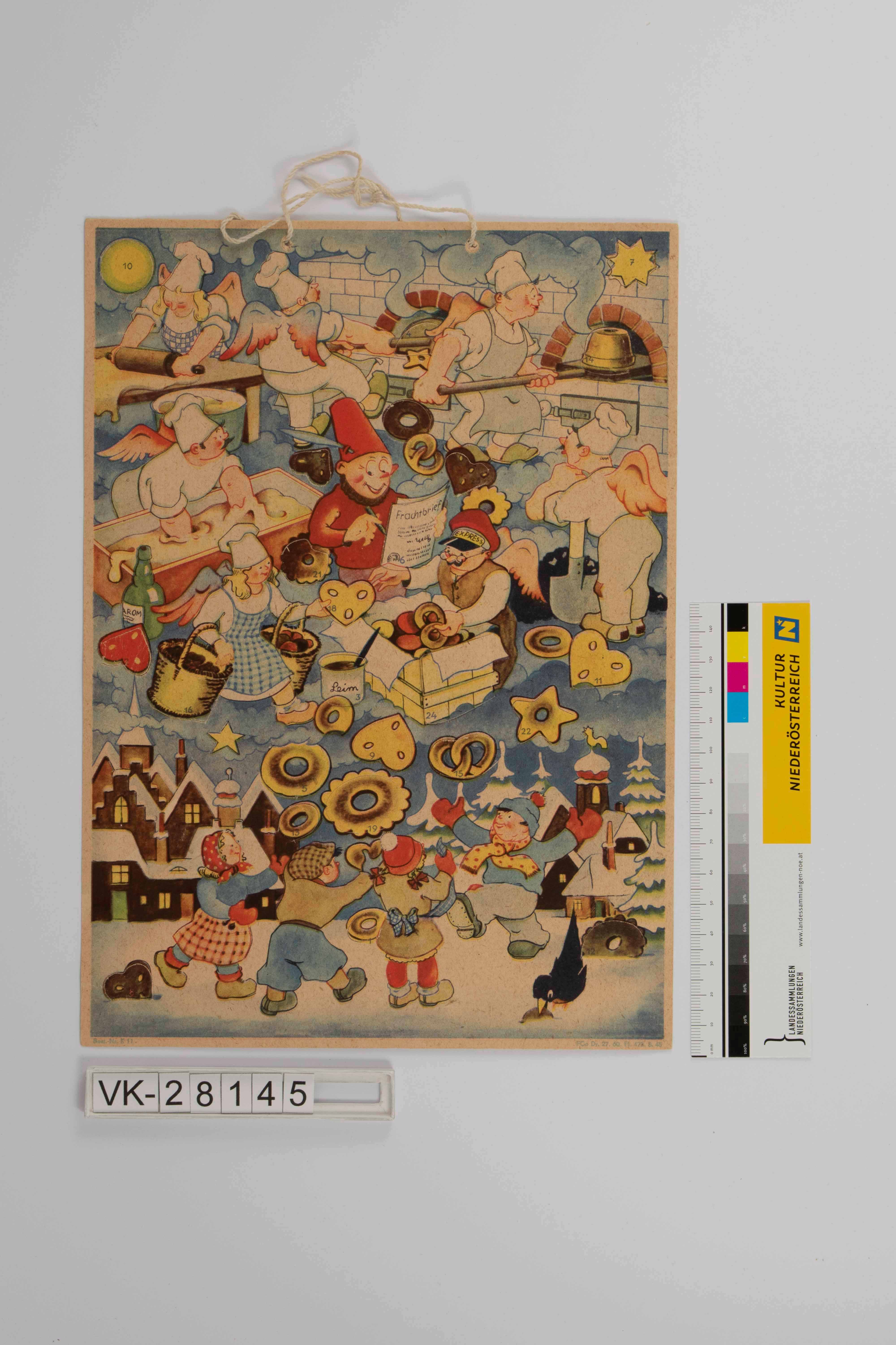 Hängeadventkalender , Hochformat mit Himmelsbäckerei; männliche geflügelte Bäcker in einer Backstube in den Wolken, darunter winterliches Dorf mit Kindern; oben mittig zwei Lochungen mit weißer Aufhängeschnur, unterschiedlich geformte Türchen; rechts und links unten Beschriftungen.