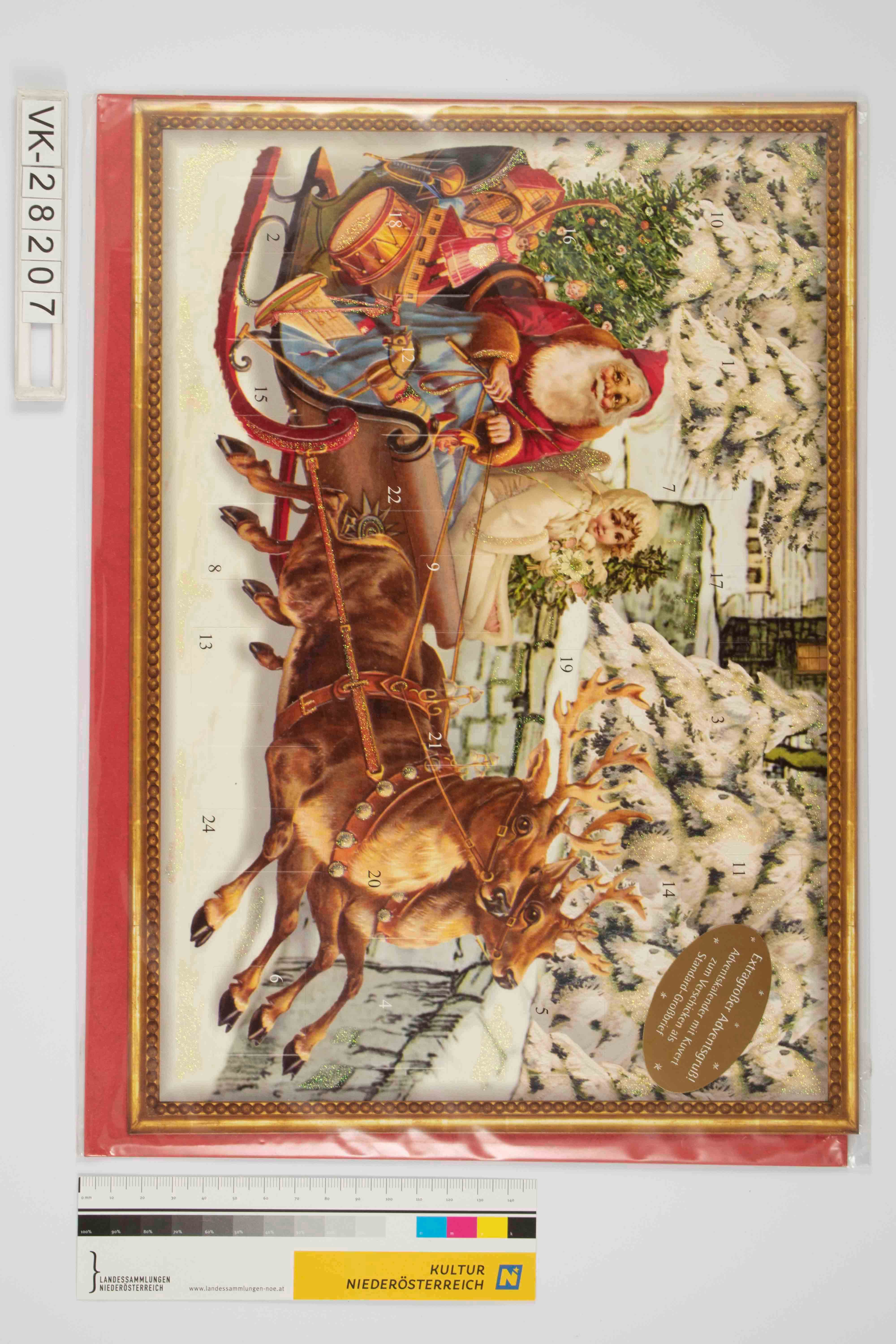 Adventkalender in als große Doppelkarte mit rotem Kuvert zum Verschicken als Weihnachtsgruß; Schlittenmotiv mit Rentieren und Weihnachtsmann sowie Engel/Christkind und Geschenken in Winterlandschaft; Bildakzente durch Beglimmerung, quadratische Türchen und goldener Bilderrahmen; rückseitig auf Verpackung Herkunftsangaben.