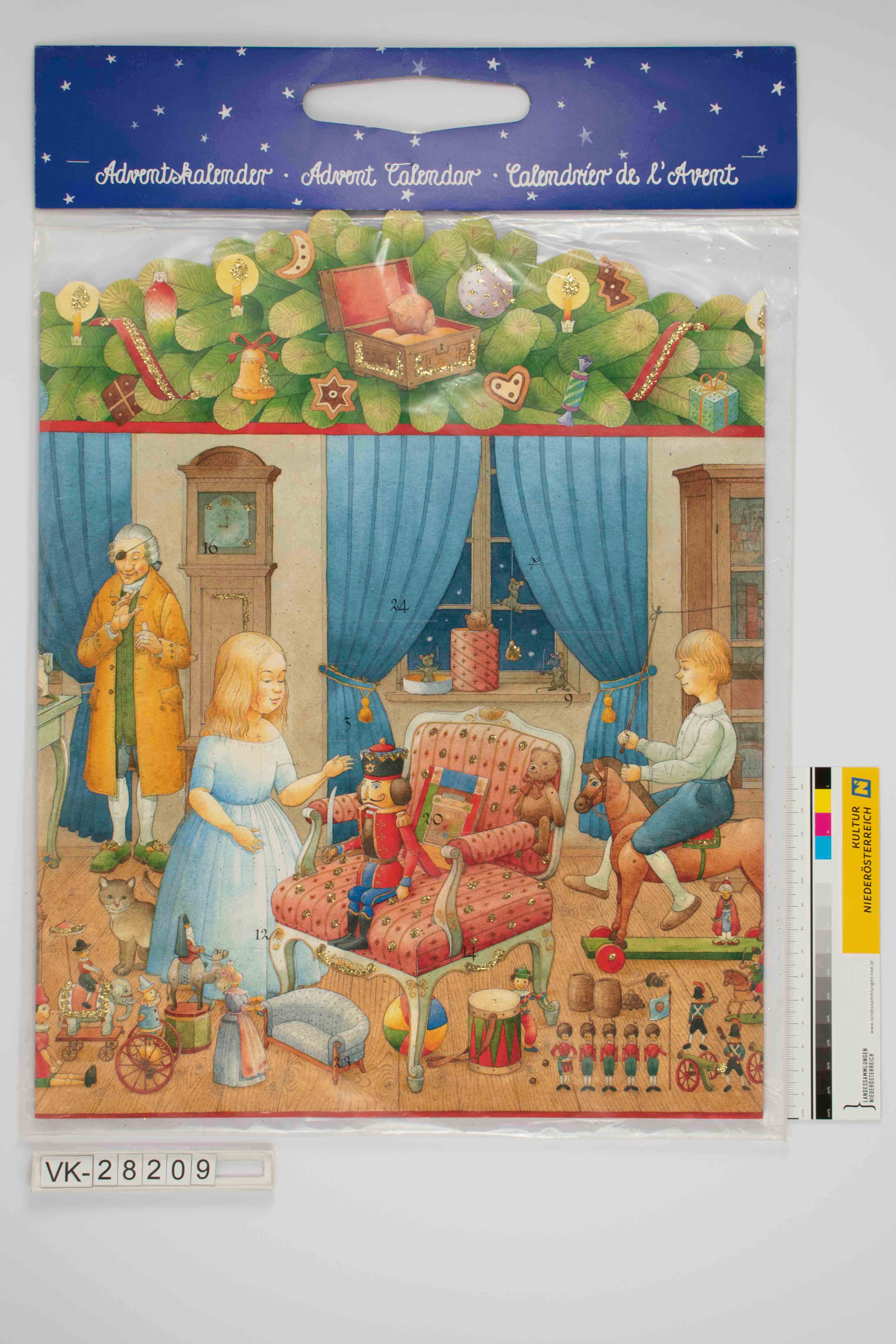Dreiflügeliger Stelladventkalender mit Nussknackerweihnacht, Darstellung des Weihnachtsfestes vor 100 Jahren, Szene mit Familie und Christbaum in Stube, viele Spielsachen und mittig Nussknacker; rot umrahmt und goldbeglimmert; Oberkante gewellt als Tannenzweigmotiv gestaltet; illustriert von Kestutis Caspara Vicius; Herstellerangaben und Information zum Bild als beigelegtes Blatt rückseitig.