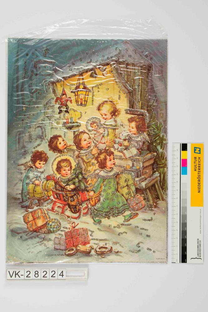 Hängeadventkalender, Hochformat mit hell erleuchtetem Marktstand in einer verschneiten Stadt mit Engelchen, Schlitten, kleinem Christbaum und Weihnachtsgeschenken; gestanzte Aufhängelochung oben mittig, rechts unten Herkunftsangabe Deutschland; aus dem Nachlass von J. Batke-Koller; beglimmert.