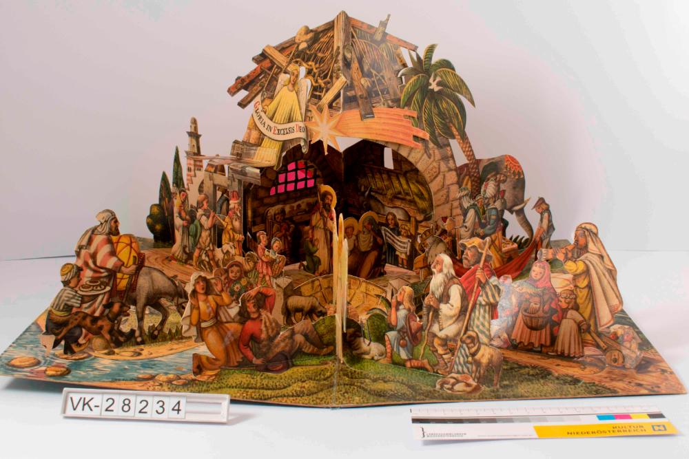 Aufklappbare Weihnachtskrippe als Diorama aus Karton; in zusammengeklapptem Zustand vorderseitig ein Engel mit Schriftzug (Gloria in excelsis Deo sowie Signatur) sowie Verlagsnummer 101; aufgeklappt detailreiche Krippenszene in orientalischer Landschaft mit Heiliger Familie, musizierenden Kindern bzw. Hirten, Stern von Bethlehem, Engeln und den Heiligen Drei Königen; im Vordergrund Verkündigungsszene mit andächtig zu Boden sinkenden Menschen und Tieren; kleiner Bach und Brücke; Signatur V. Kubasta, rückseitig Aufschrift Foreign.