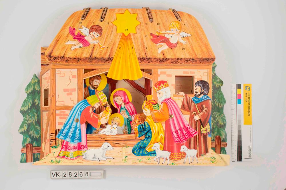 Dreidimensionaler, beweglicher Aufstelladventkalender in Form eines Stalles mit Krippenszene; strohgedecktes Fachwerkgebäude mit Heiliger Familie und Gaben darbringenden Heiligen Drei Königen sowie einem Hirten mit Schafen; über dem Dach Engelchen mit Trompeten sowie Stern; innen beschriftet mit M und Herkunftsangabe Dänemark und Nummer 10 88 07.