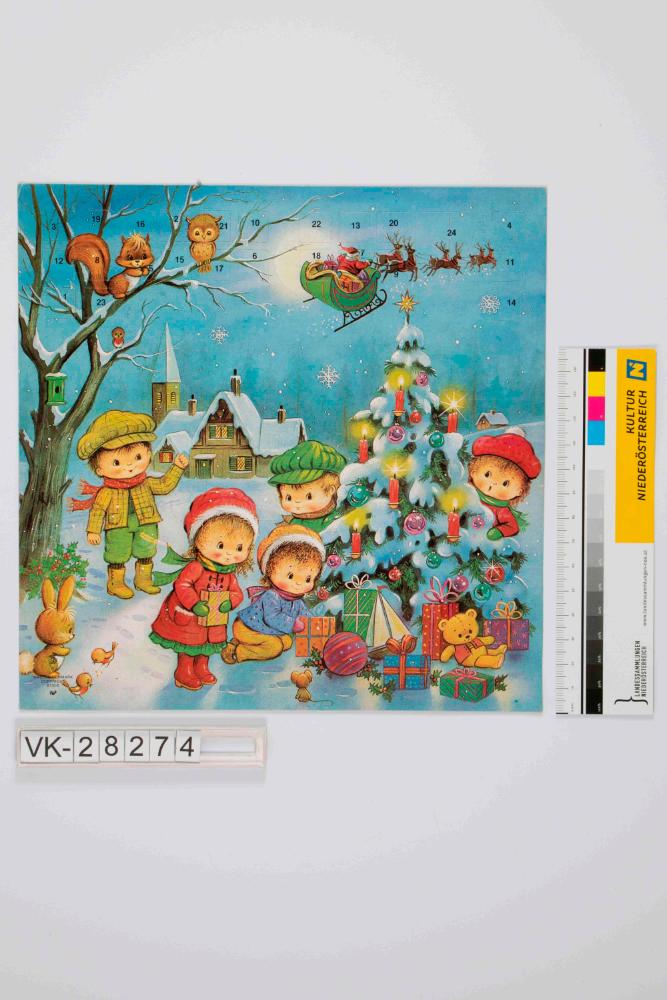 Quadratischer, dreidimensionaler Hängeadventkalender mit großer gestanzter Aufhängelochung oben mittig; zwei Reihen quadratische Türchen in oberem Bildviertel; geschmückter Christbaum mit Packerl in winterlich verschneiter Landschaft mit fünf Kindern und kleinen Tieren, hintergründig Gehöft mit Kirche, im Himmel Weihnachtsmann in Rentierschlitten; links unten Herkunftsangabe Dänemark und die Nummer 8130-6; vgl. VK-28275.