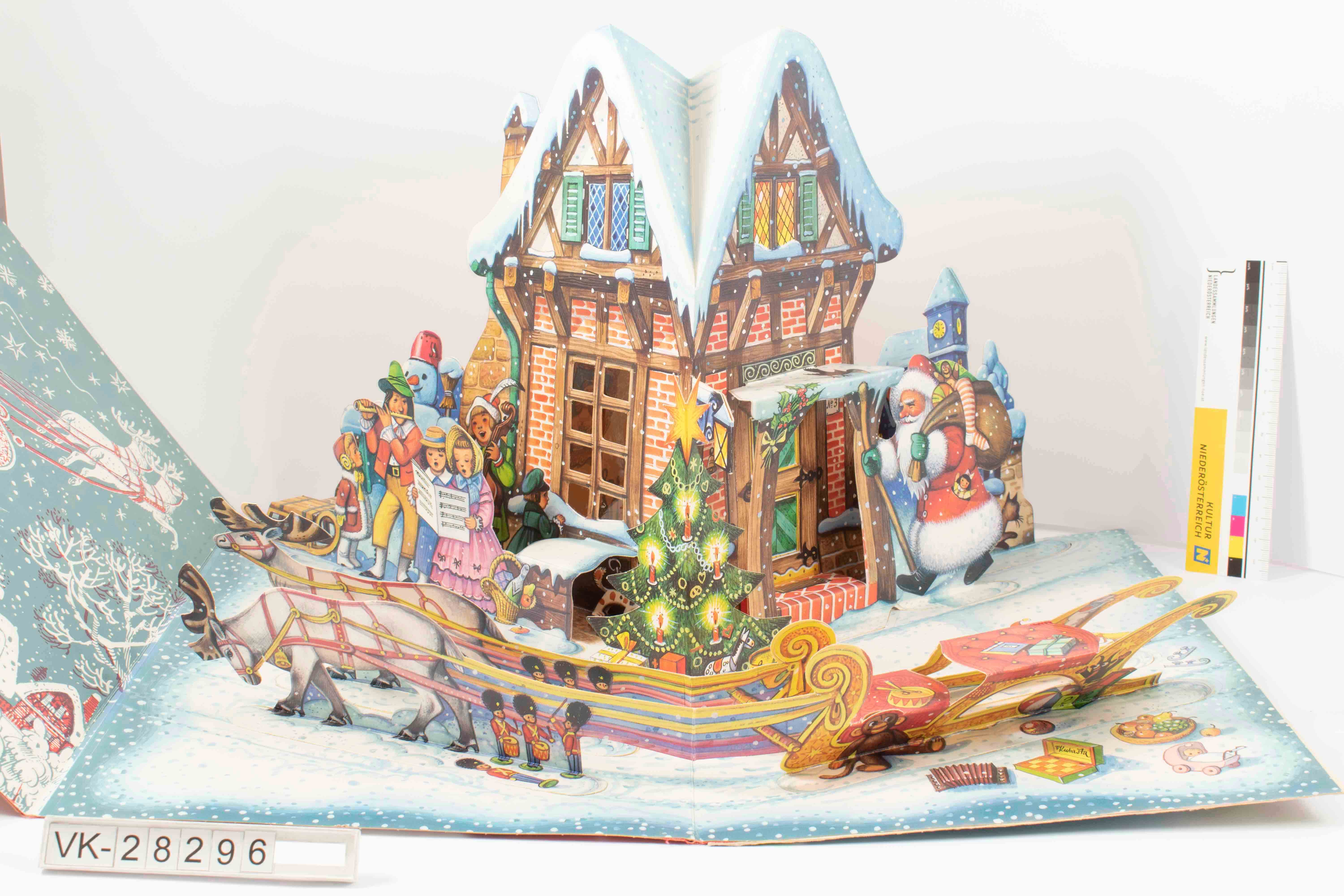 Weihnachtsdiorama, aufklappbar, in Buchform; auf der Vorderseite ist ein beweglicher Weihnachtsmann, Augen und Mund können durch untenstehende Kartonlasche bewegt werden; aufgeklappt faltet sich ein Fachwerkhaus auf, vor welchem ein Rentierschlitten parkt und ein Christbaum steht; musizierende Menschen sowie ein Weihnachtsmann befinden sich vor dem Haus, hintergründig eine verschneite Kirche; rückseitig ist ein Christkindlbrief zum Ausfüllen; Bilder sind signiert mit V. Kubasta; auf der Rückseite Herkunftsangaben.
