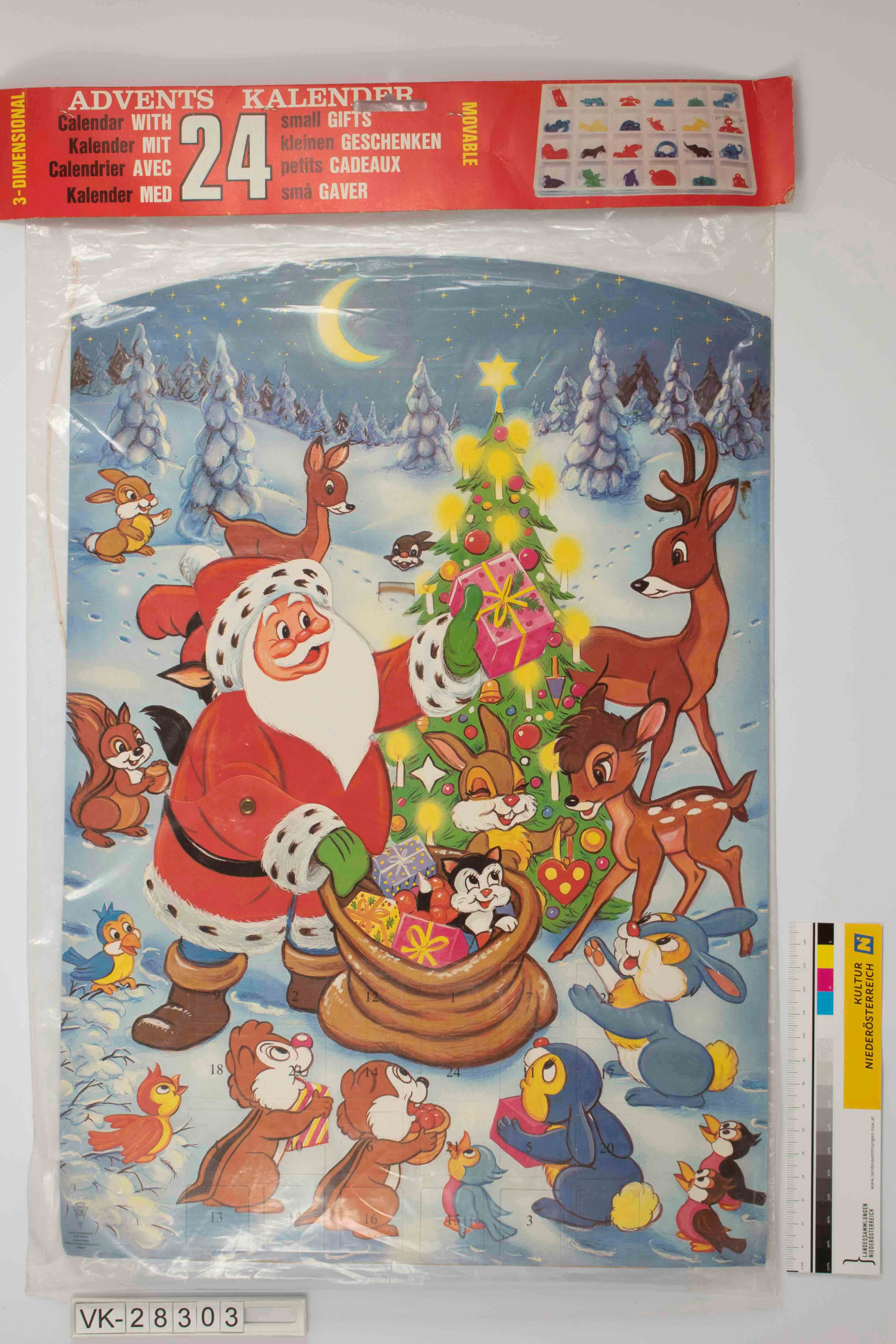 Beweglicher Hängeadventkalender; Darstellung von Weihnachtsmann und geschmücktem Christbaum in Waldszene mit vielen Tieren; Weihnachtsmann teilt aus einem Sack Geschenke an die Tiere in einer tief verschneiten Landschaft aus, darüber Sternenhimmel und Halbmond; in der unteren Bildhälfte quadratische, regelmäßig in Reihen angeordnete Adventkalendertürchen hinter welchen sich Spielzeug befindet; links unten Herkunftsangaben und Nummer 128214 und Logo GEMO; Maße in verpacktem Zustand.