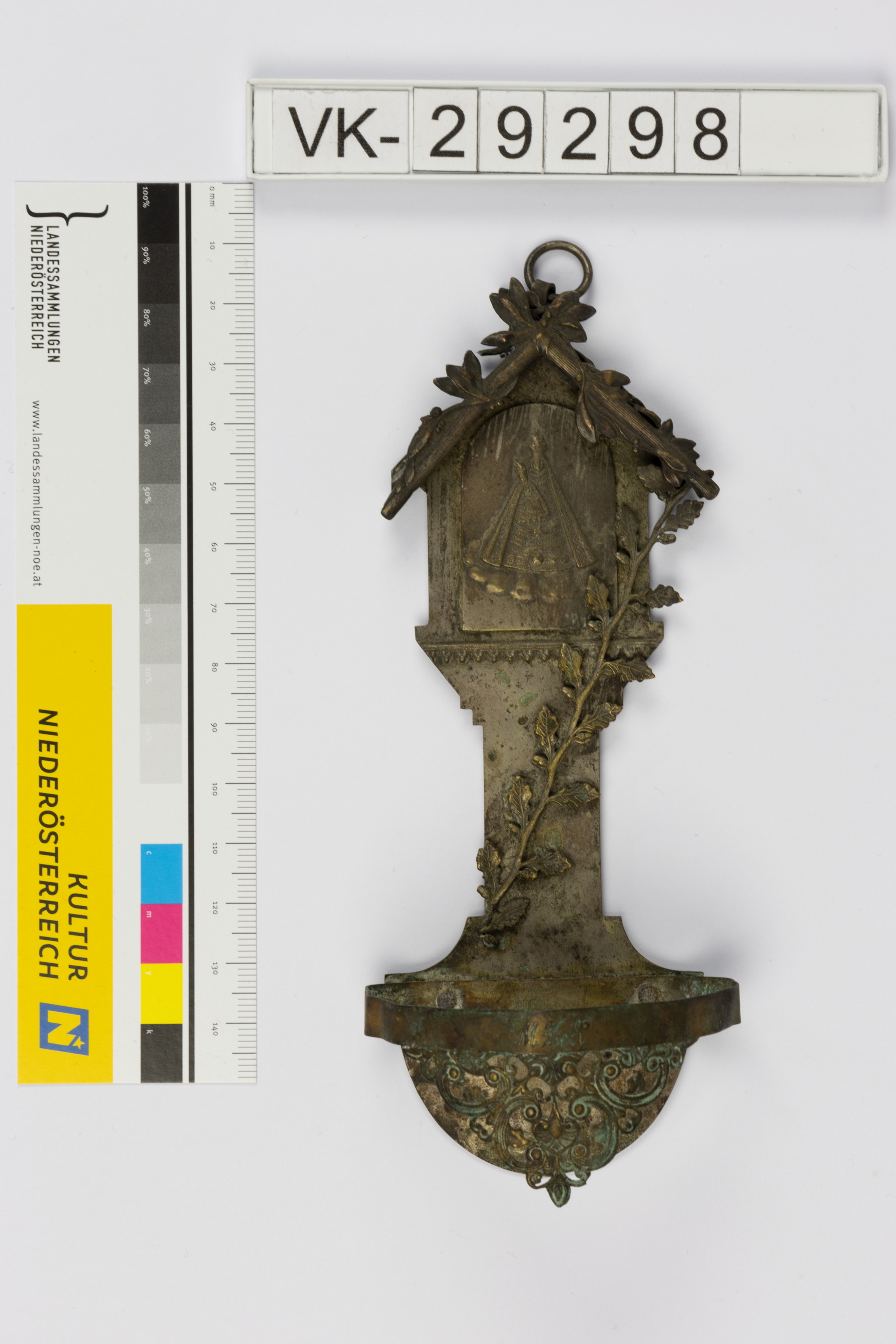 Weihbrunnkessel aus Blech mit einer Darstellung von Mariazell unter einem Blätterdach. Der Glaseinsatz fehlt.