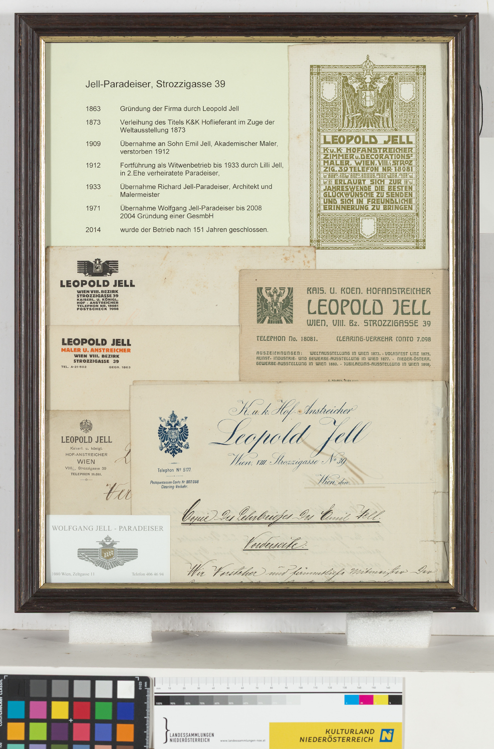 Gerahmte Werbe- und Visitenkarten sowie Briefpapiere der Firma Leopold Jell