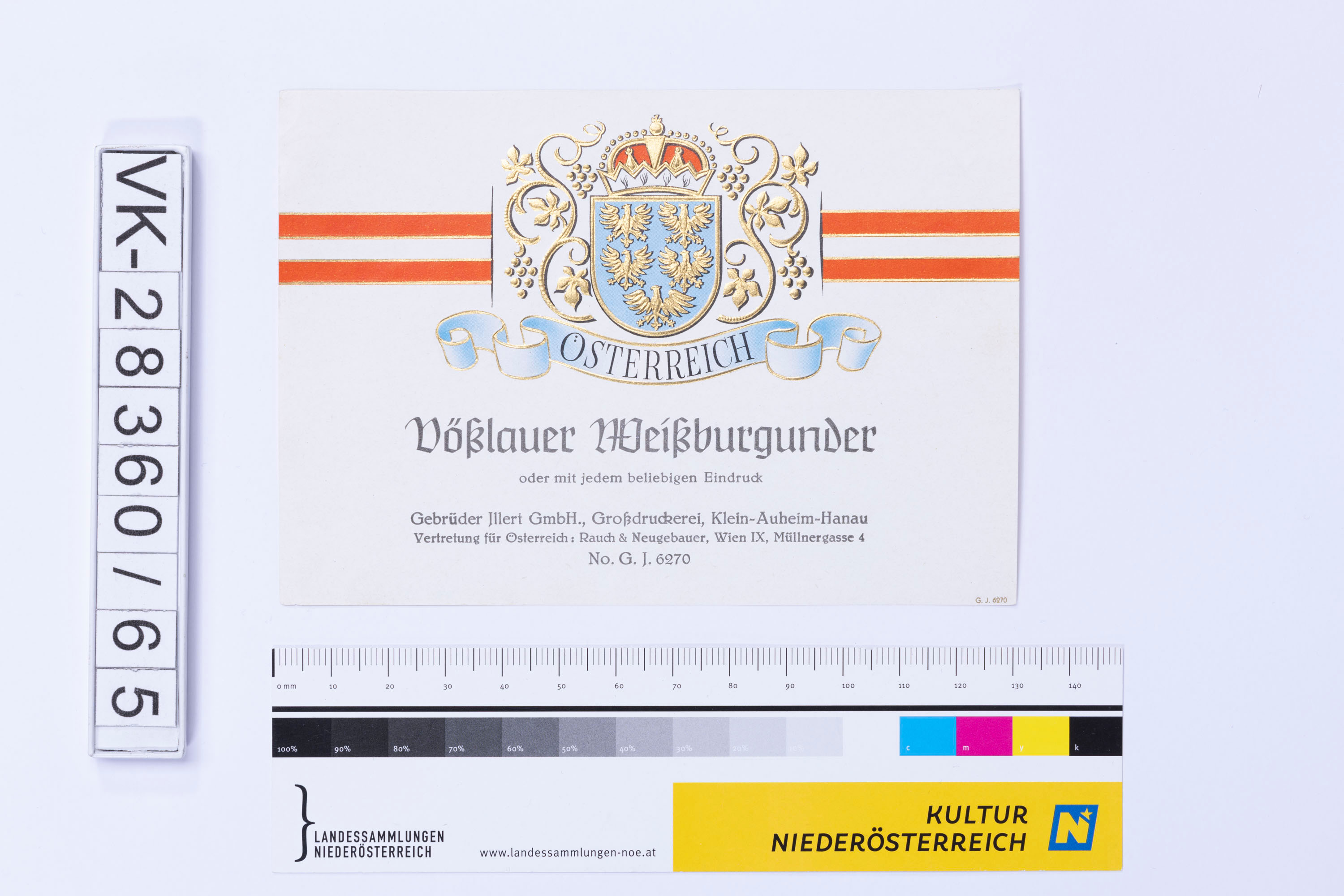 Abgelöstes Weinflaschenetikett aus einer Sammlung von den 1940er bis zu den frühen 1960er Jahren; Weinsorte: "Vöslauer Weißburgunder", Beschriftung "oder mit jedem beliebigen Eindruck", Wappen NÖ, hinterlegte österreischische Flagge und Banner "ÖSTERREICH"; Weinbau, Kellerei bzw. Handel: "Gebrüder Illert GmbH, Großdruckerei, Klein-Auheim-Hanau Vertretung für Österreich: Rauch & Neugebauer, Wien IX, Müllnergasse 4"