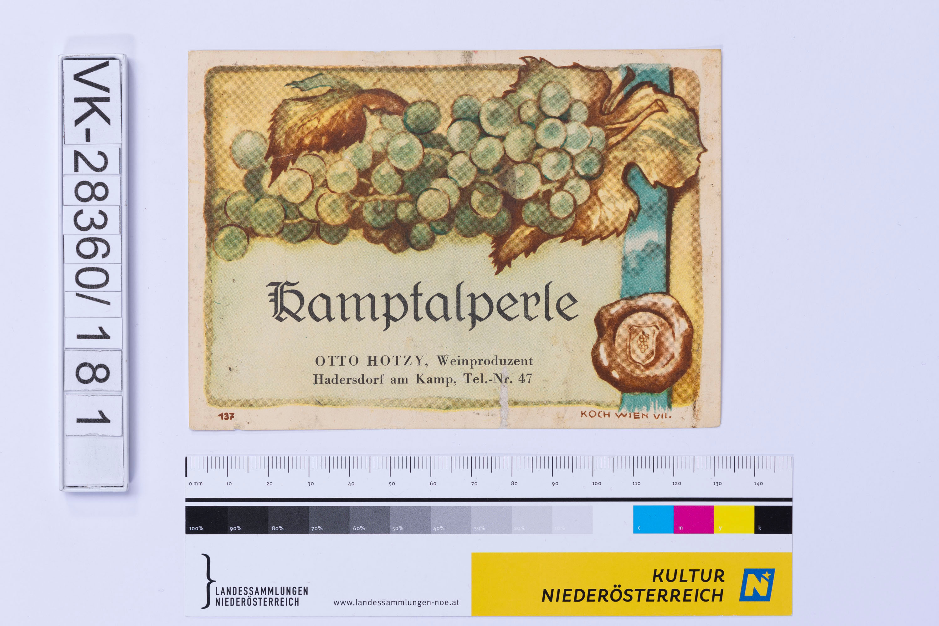 Abgelöstes Weinflaschenetikett aus einer Sammlung von den 1940er bis zu den frühen 1960er Jahren; Weinsorte: "Kamptalperle", Darstellung von Weinreben; Weinbau, Kellerei bzw. Handel: "OTTO HOTZY, Weinproduzent Hadersdorf am Kamp, Tel.-Nr. 47"