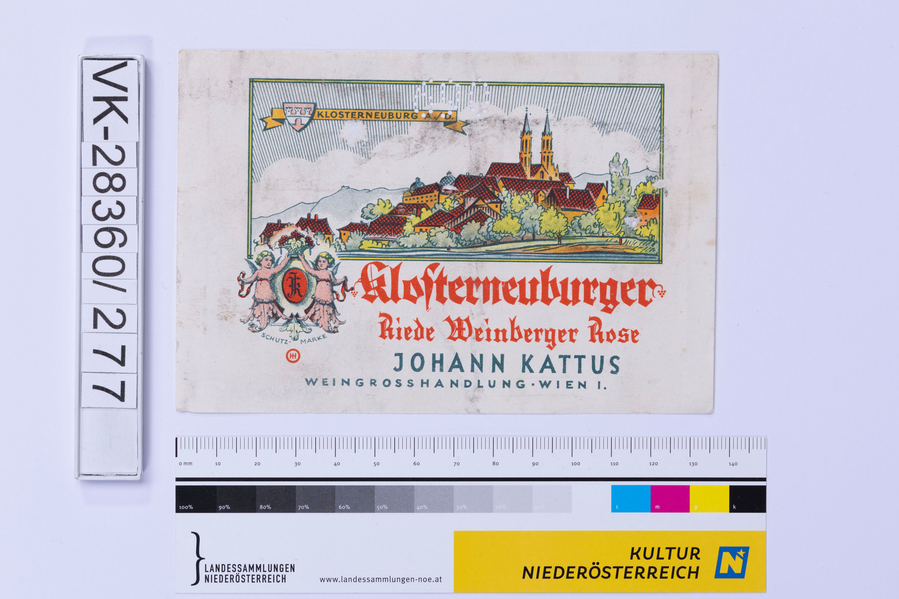 Abgelöstes Weinflaschenetikett aus einer Sammlung von den 1940er bis zu den frühen 1960er Jahren; Weinsorte: "Klosterneuburger Riede Weinberger Rose", Stadtansicht mit Schutzmarke; Weinbau, Kellerei bzw. Handel: "JOHANN KATTUS WEINGROSSHANDLUNG WIEN I."