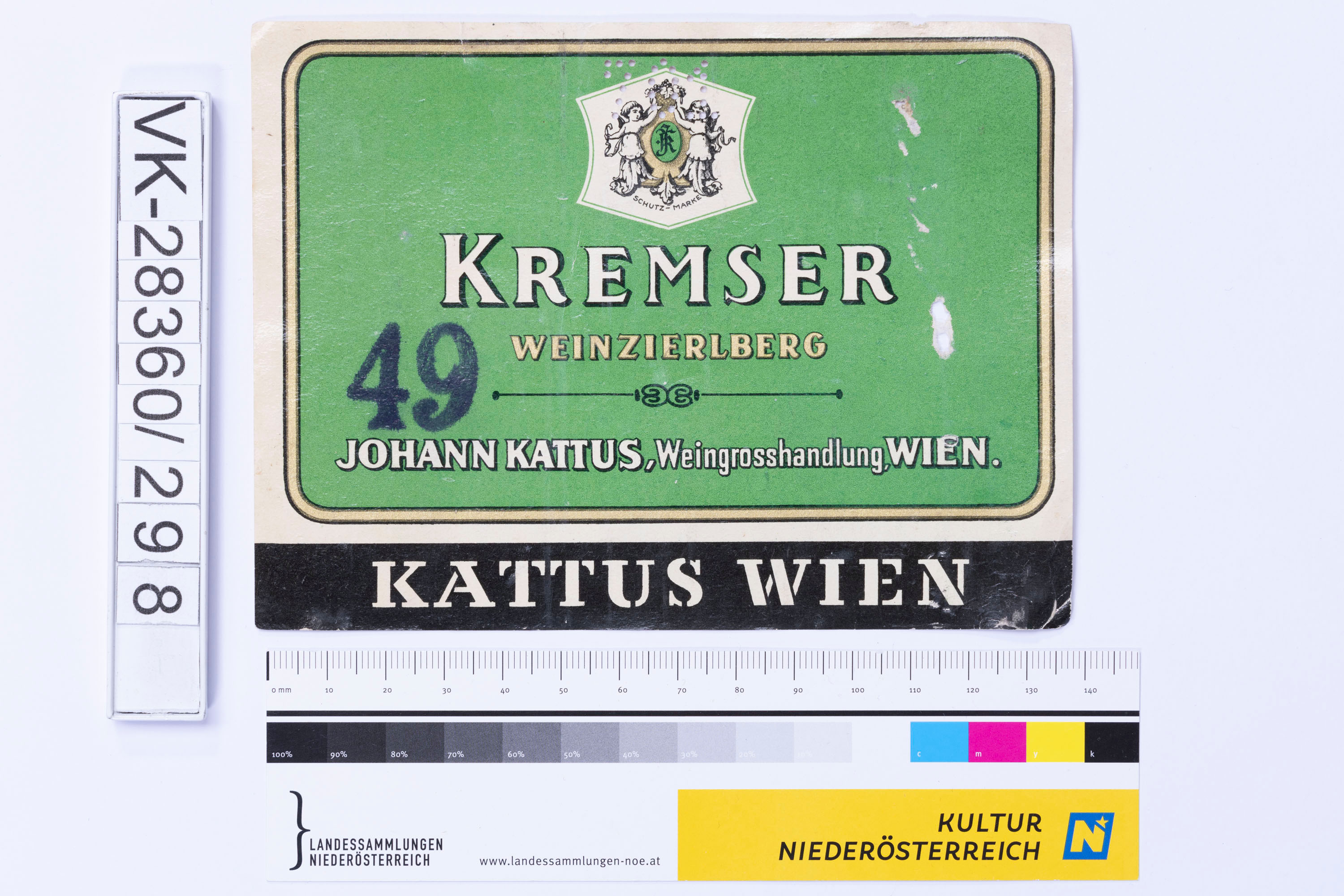 Abgelöstes Weinflaschenetikett aus einer Sammlung von den 1940er bis zu den frühen 1960er Jahren; Weinsorte: "KREMSER WEINZIERLBERG", Markenzeichen; Weinbau, Kellerei bzw. Handel: "JOHANN KATTUS, Weingrosshandlung, WIEN. KATTUS WIEN"