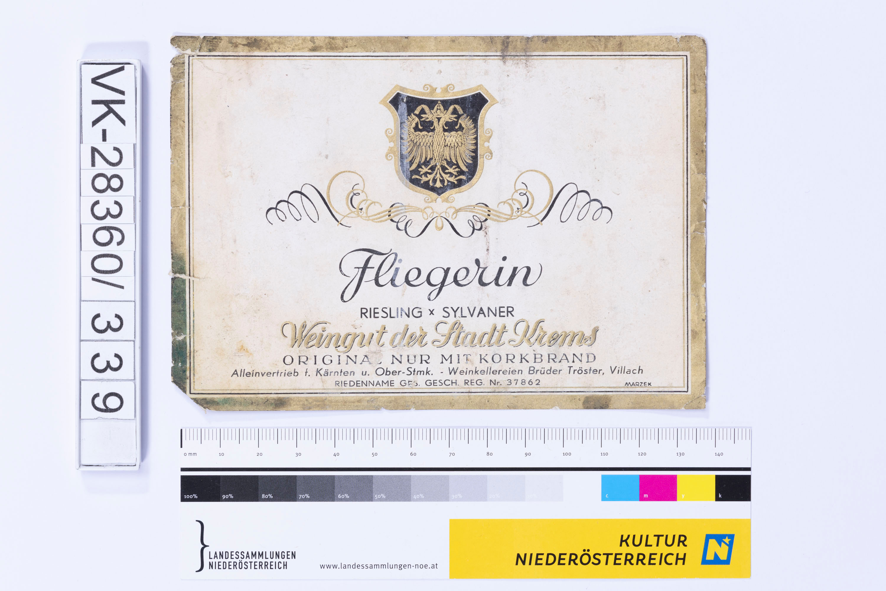 Abgelöstes Weinflaschenetikett aus einer Sammlung von den 1940er bis zu den frühen 1960er Jahren; Weinsorte: "Fliegerin RIESLING x SYLVANER", Wappendarstellung; Weinbau, Kellerei bzw. Handel: "Weingut der Stadt Krems", Vertrieb "Alleinvertrieb f. Kärtnen u. Ober-Stmk. - Weinkellereien Brüder Tröster, Villach"