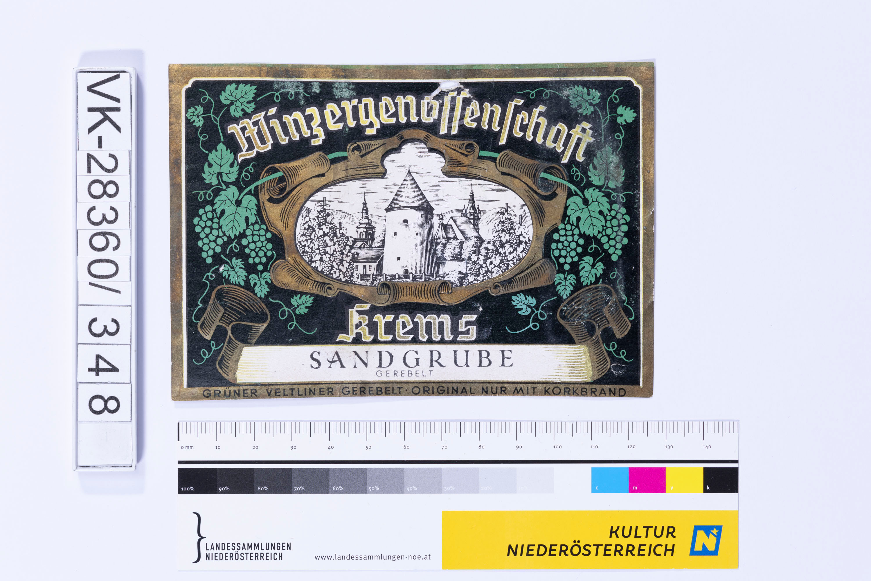 Abgelöstes Weinflaschenetikett aus einer Sammlung von den 1940er bis zu den frühen 1960er Jahren; Weinsorte: "SANDGRUBE GEREBELT", Stadtansicht mit Weinreben; Weinbau, Kellerei bzw. Handel: "WINZERGENOSSENSCHAFT KREMS"