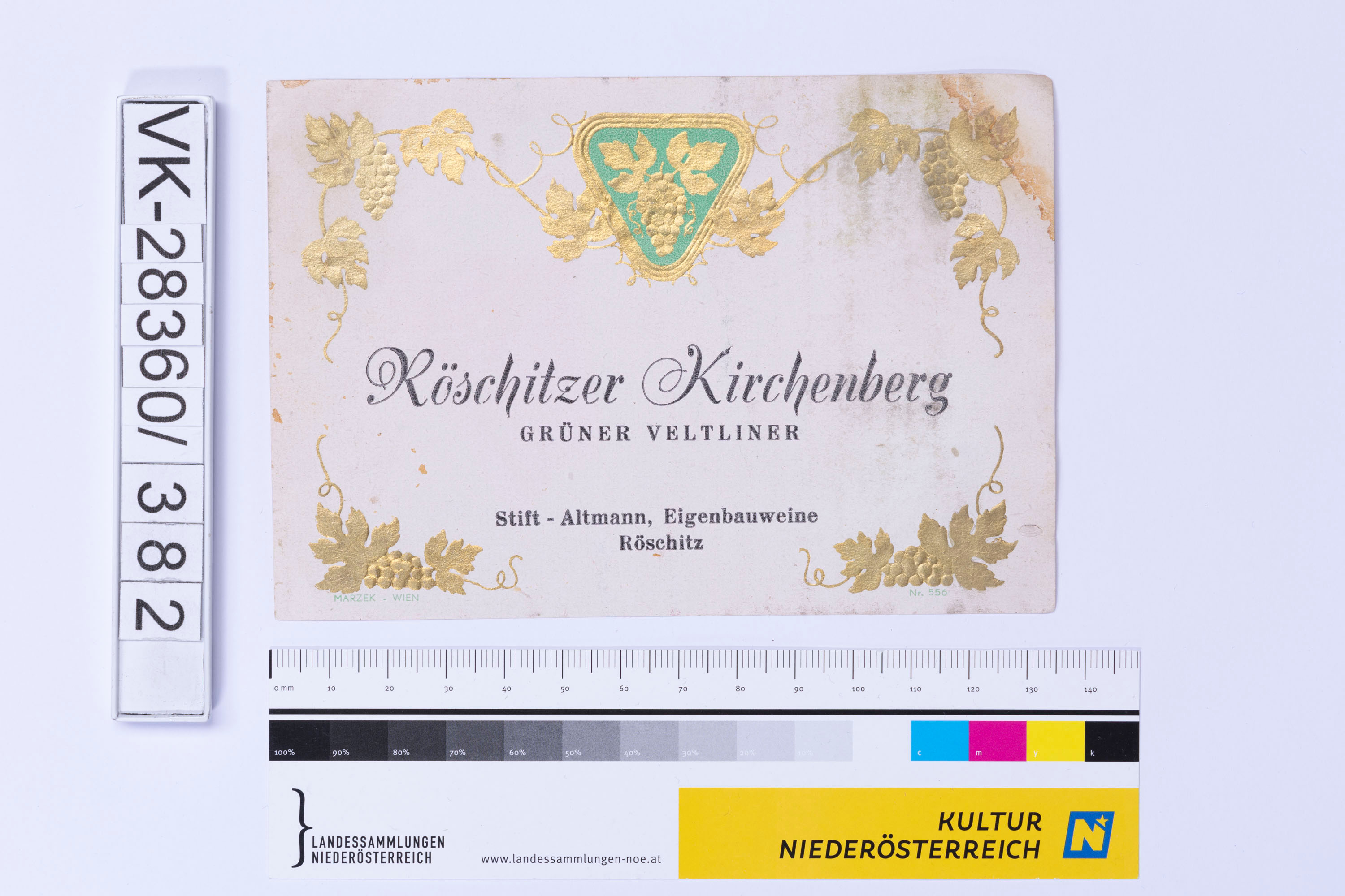 Abgelöstes Weinflaschenetikett aus einer Sammlung von den 1940er bis zu den frühen 1960er Jahren; Weinsorte: "Röschitzer Kirchenberg GRÜNER VELTLINER", Wappendarstellung und Weinreben; Weinbau, Kellerei bzw. Handel: "Stift-Altmann, Eigenbauweine Röschitz"