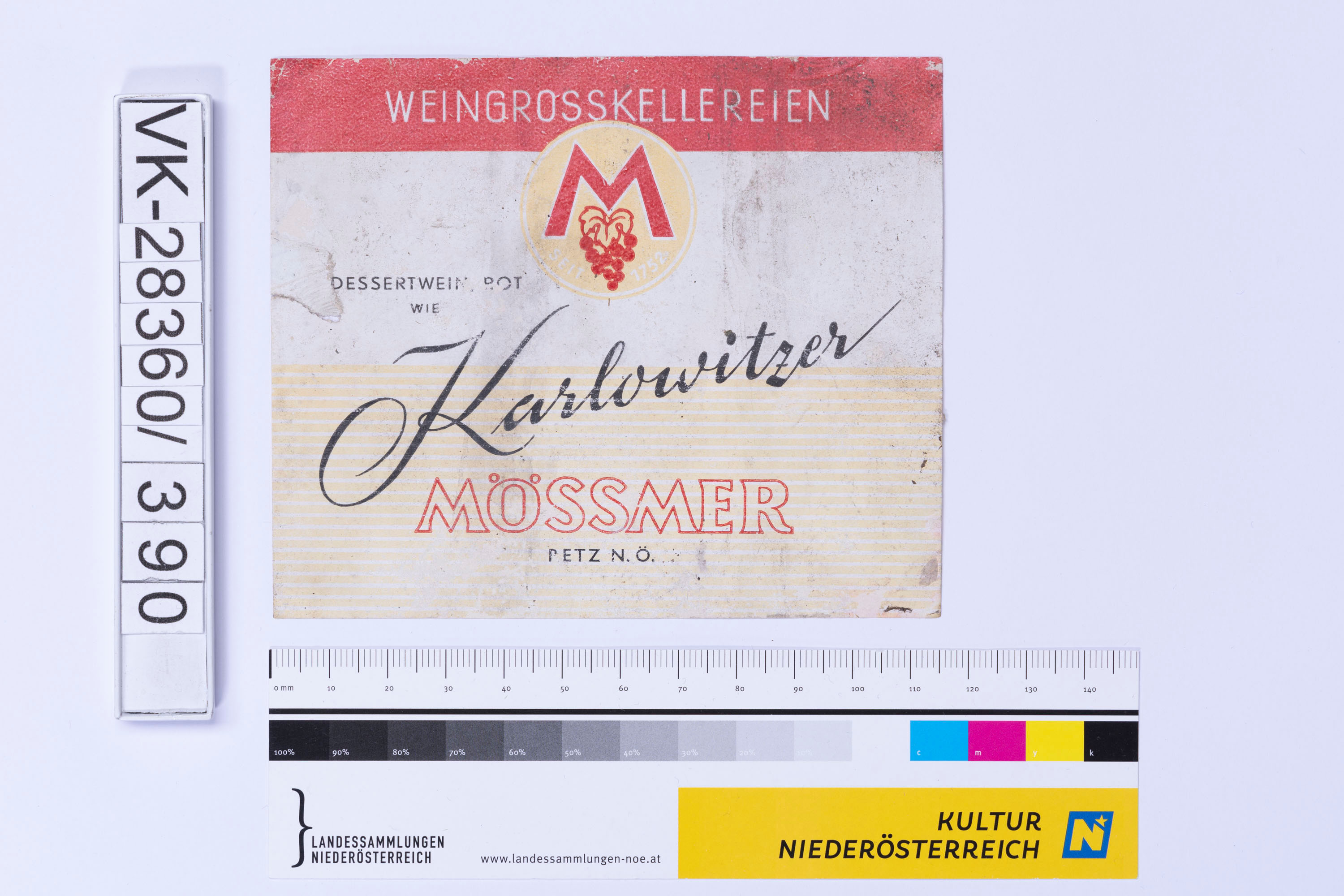 Abgelöstes Weinflaschenetikett aus einer Sammlung von den 1940er bis zu den frühen 1960er Jahren; Weinsorte: "Karlowitzer", Markenzeichen; Weinbau, Kellerei bzw. Handel: "WEINGROSSKELLEREIEN MÖSSMER RETZ N.Ö."