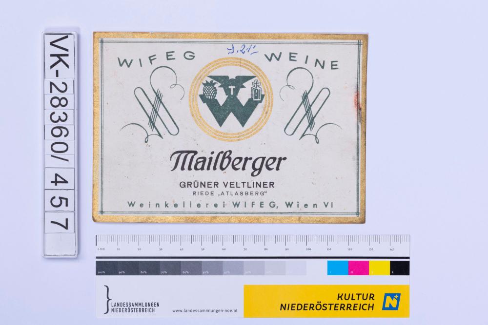 Abgelöstes Weinflaschenetikett aus einer Sammlung von den 1940er bis zu den frühen 1960er Jahren; Weinsorte: "Mailberger GRÜNER VELTLINER", Markenzeichen; Weinbau, Kellerei bzw. Handel: "Weinkellerei WIFEG, WIEN VI."