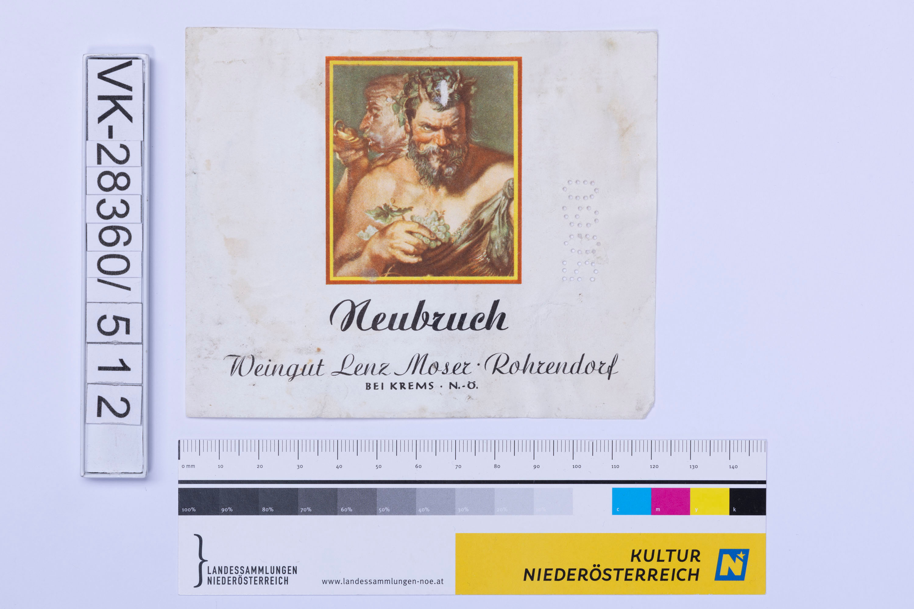 Abgelöstes Weinflaschenetikett aus einer Sammlung von den 1940er bis zu den frühen 1960er Jahren; Weinsorte: "Neubruch", Darstellung zweier Satyre; Weinbau, Kellerei bzw. Handel: "Weingut Lenz Moser Rohrendorf BEI KREMS N.Ö."