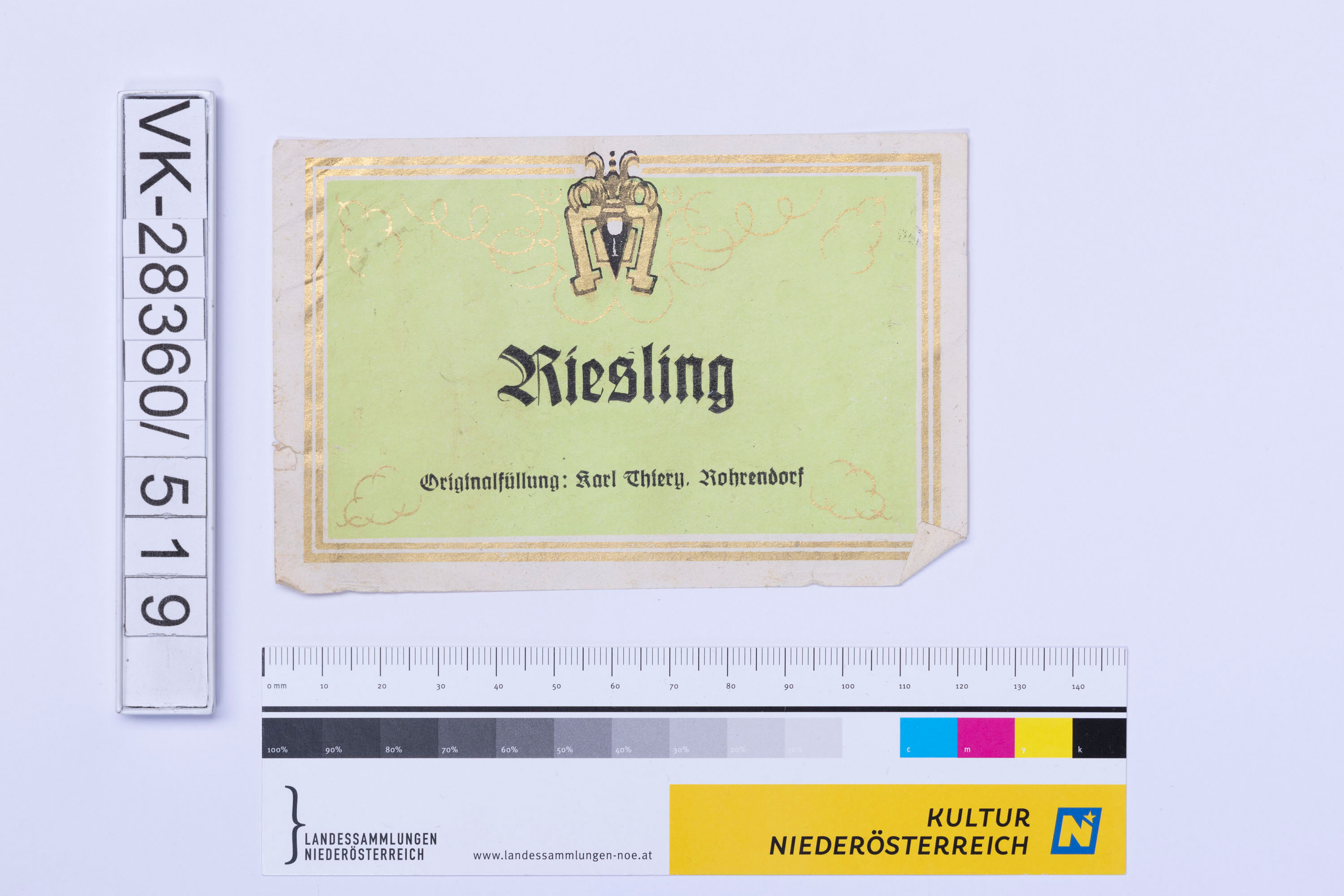 Abgelöstes Weinflaschenetikett aus einer Sammlung von den 1940er bis zu den frühen 1960er Jahren; Weinsorte: "Riesling", Wappendarstellung; Weinbau, Kellerei bzw. Handel: "Karl Thiery, Rohrendorf"