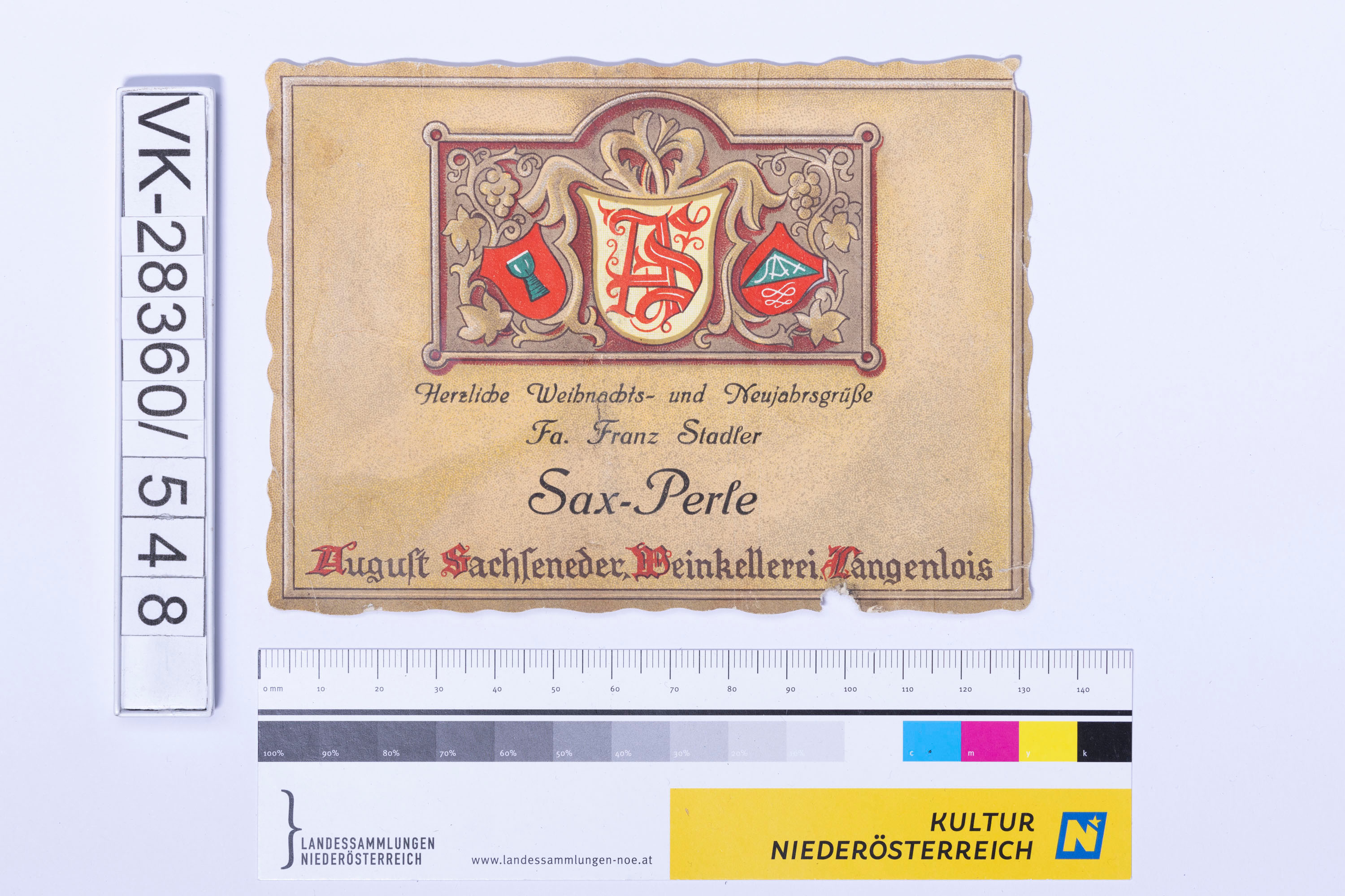 Abgelöstes Weinflaschenetikett aus einer Sammlung von den 1940er bis zu den frühen 1960er Jahren; Weinsorte: "Sax-Perle", Wappendarstellung und Grüße "Herzliche Weihnachts- und Neujahrsgrüße Fa. Franz Stadler"; Weinbau, Kellerei bzw. Handel: "August Sachseneder, Weinkellerei Langenlois"
