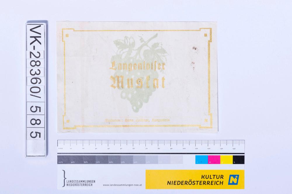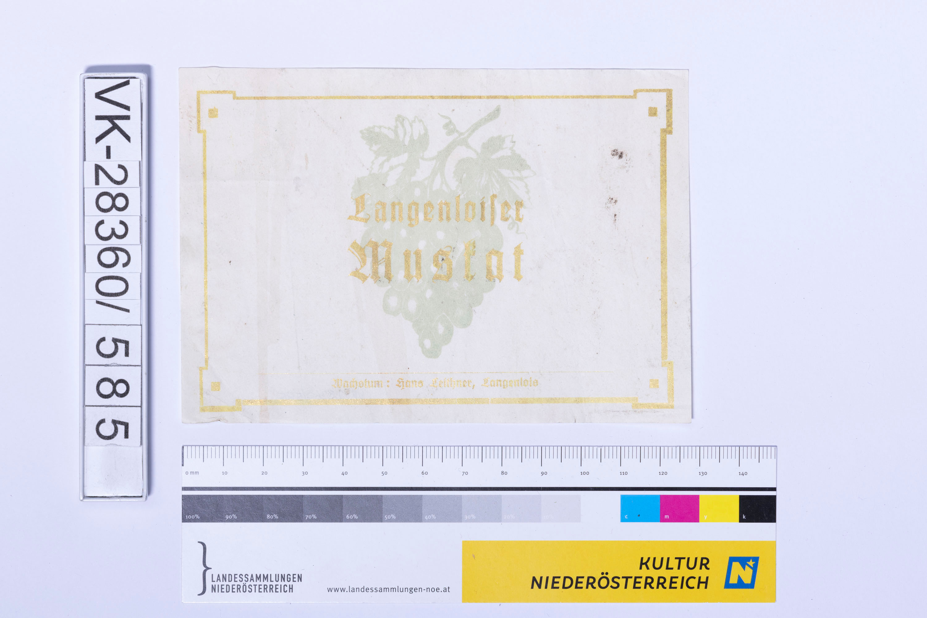 Abgelöstes Weinflaschenetikett aus einer Sammlung von den 1940er bis zu den frühen 1960er Jahren; Weinsorte: "Langenloiser Muskat", Darstellung einer Weinrebe; Weinbau, Kellerei bzw. Handel: "Hans Leithner, Langenlois"
