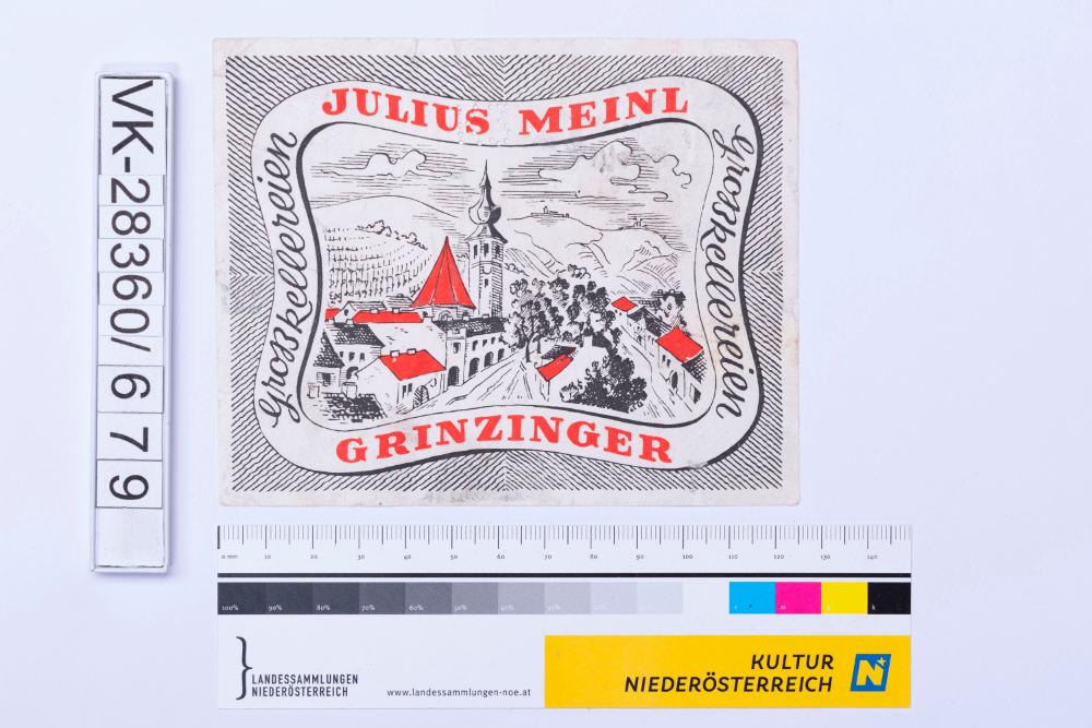 Abgelöstes Weinflaschenetikett aus einer Sammlung von den 1940er bis zu den frühen 1960er Jahren; Weinsorte: "GRINZINGER", Stadtansicht; "Großkellereien JULIUS MEINL"