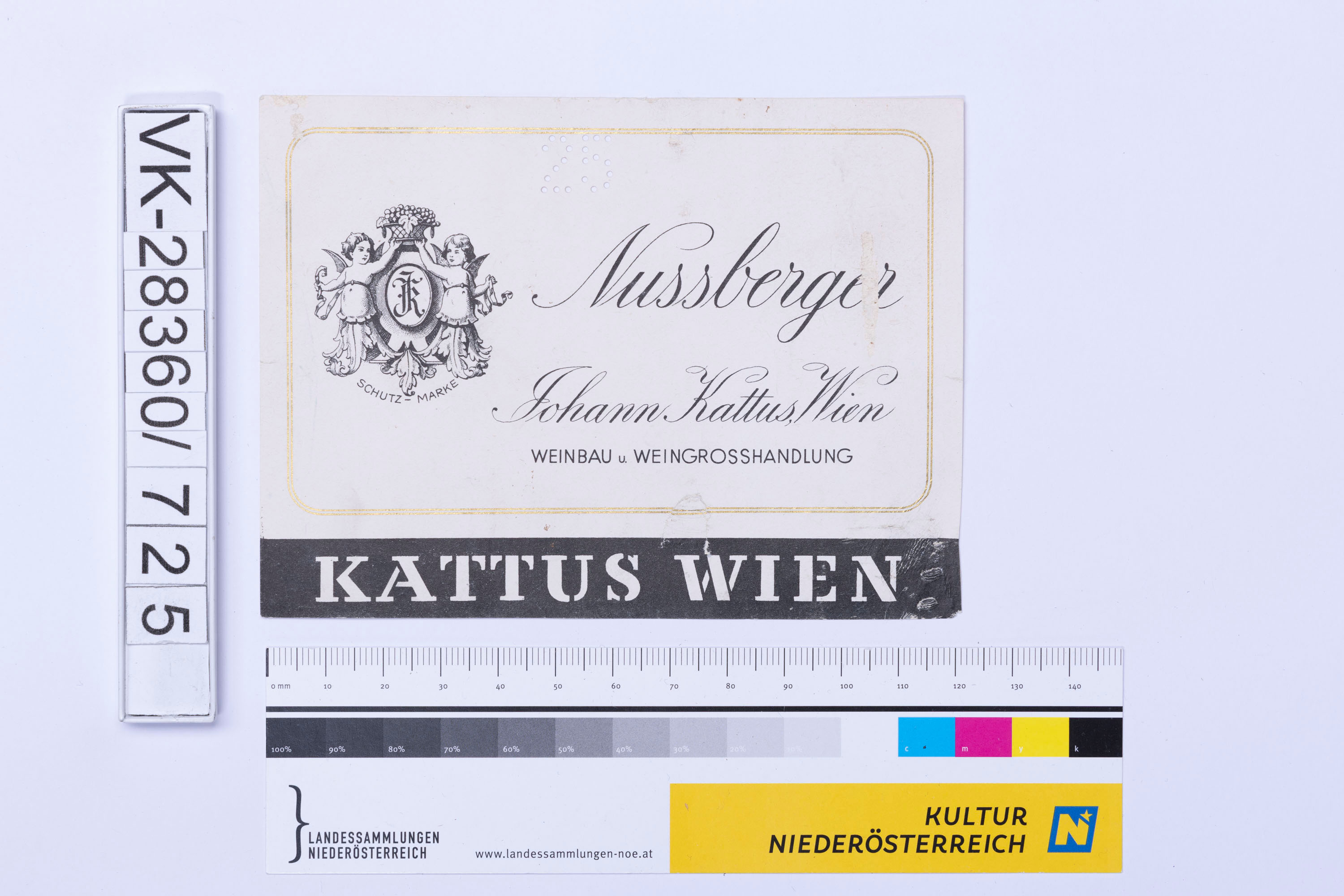 Abgelöstes Weinflaschenetikett aus einer Sammlung von den 1940er bis zu den frühen 1960er Jahren; Weinsorte: "Nussberger", Schutzmarke; Weinbau, Kellerei bzw. Handel: "Johann Kattus Wien WEINBAU u. WEINGROSSHANDLUNG"