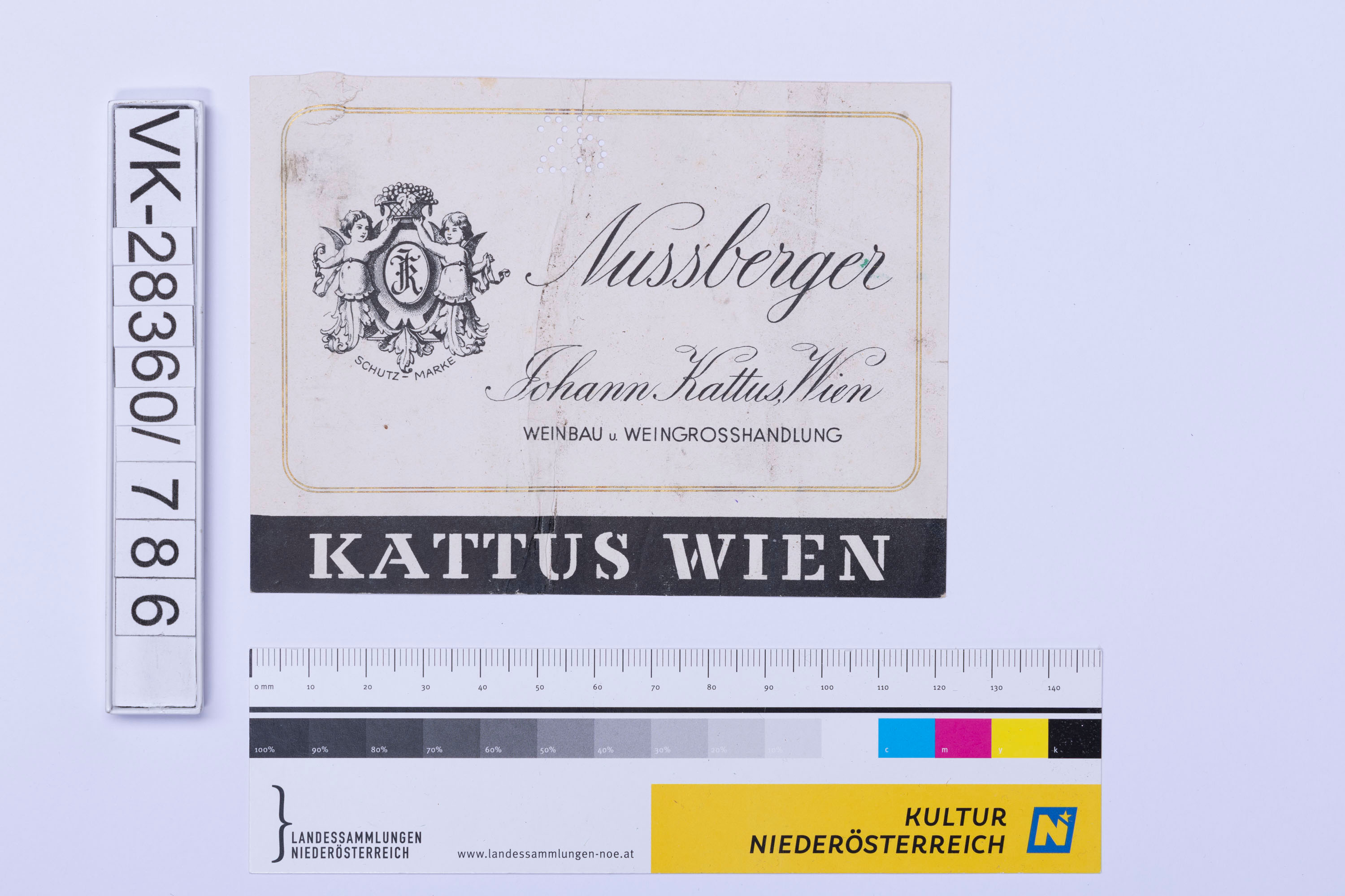 Abgelöstes Weinflaschenetikett aus einer Sammlung von den 1940er bis zu den frühen 1960er Jahren; Weinsorte: "Nussberger", Schutzmarke; Weinbau, Kellerei bzw. Handel: "Johann Kattus Wien WEINBAU u. WEINGROSSHANDLUNG"