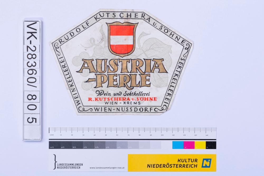 Abgelöstes Weinflaschenetikett aus einer Sammlung von den 1940er bis zu den frühen 1960er Jahren; Weinsorte: "AUSTRIAPERLE", Wappendarstellung und Weinreben; Weinbau, Kellerei bzw. Handel: "WEINKELLEREI RUDOLF KUTSCHERA u. SÖHNE SEKTKELLEREI WIEN-NUSSDORF"
