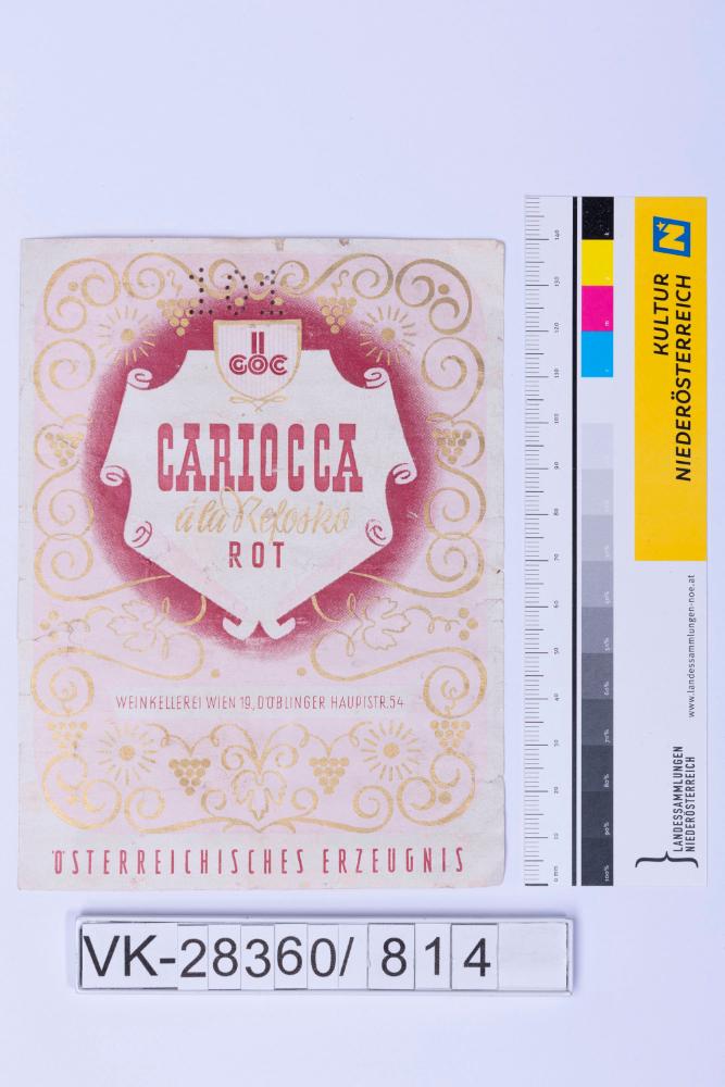 Abgelöstes Weinflaschenetikett aus einer Sammlung von den 1940er bis zu den frühen 1960er Jahren; Weinsorte: "CARIOCCA á la Refosko ROT", Darstellung von Weinreben; Weinbau, Kellerei bzw. Handel: "WEINKELLEREI WIEN 19., DÖBLINGER HAUPTSTR. 54"