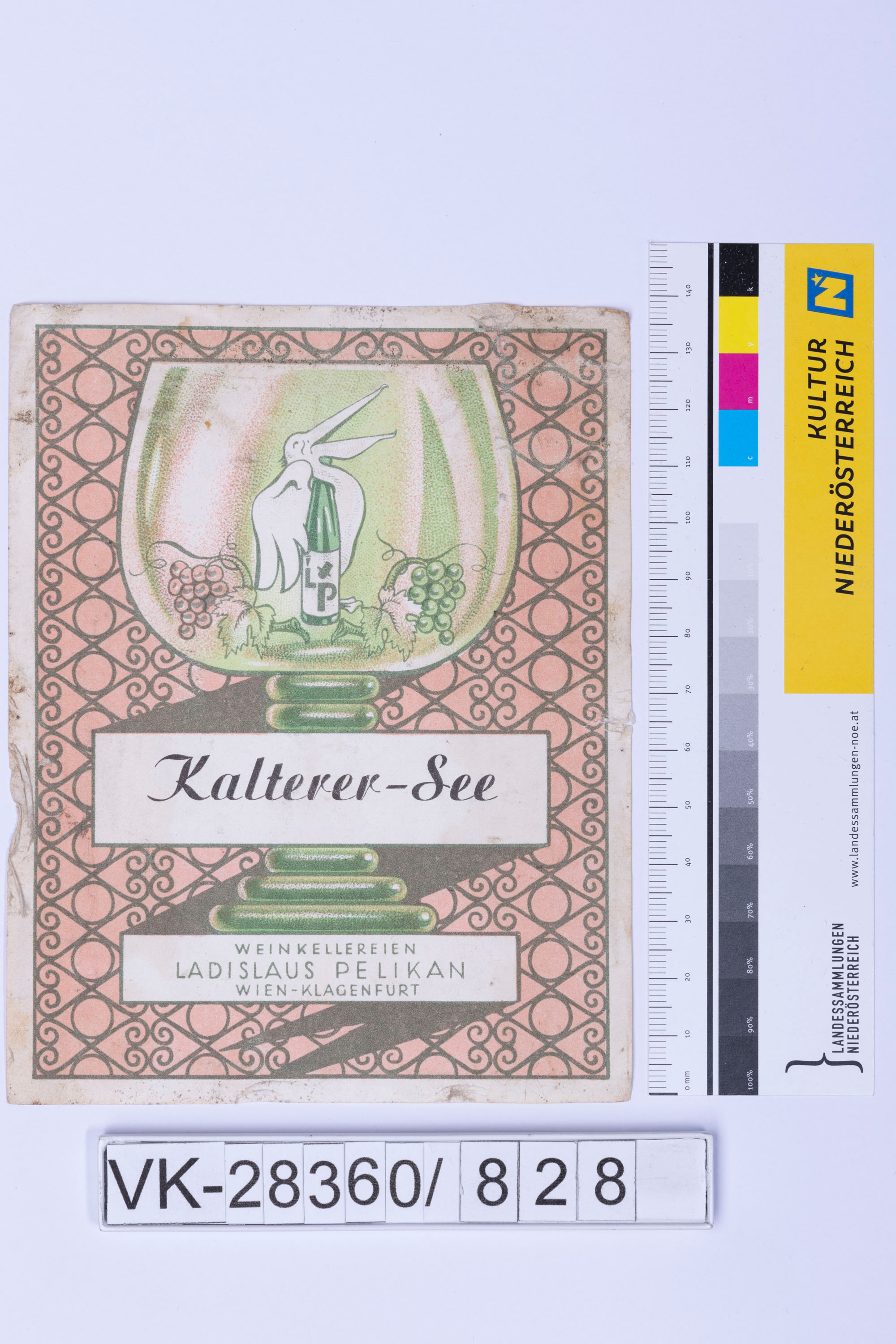 Abgelöstes Weinflaschenetikett aus einer Sammlung von den 1940er bis zu den frühen 1960er Jahren; Weinsorte: "Kalterer-See", Darstellung von einem Weinglas mit Pelikan, Weinflasche und -reben; Weinbau, Kellerei bzw. Handel: "WEINKELLEREIEN LADISLAUS PELIKAN WIEN-KLAGENFURT"