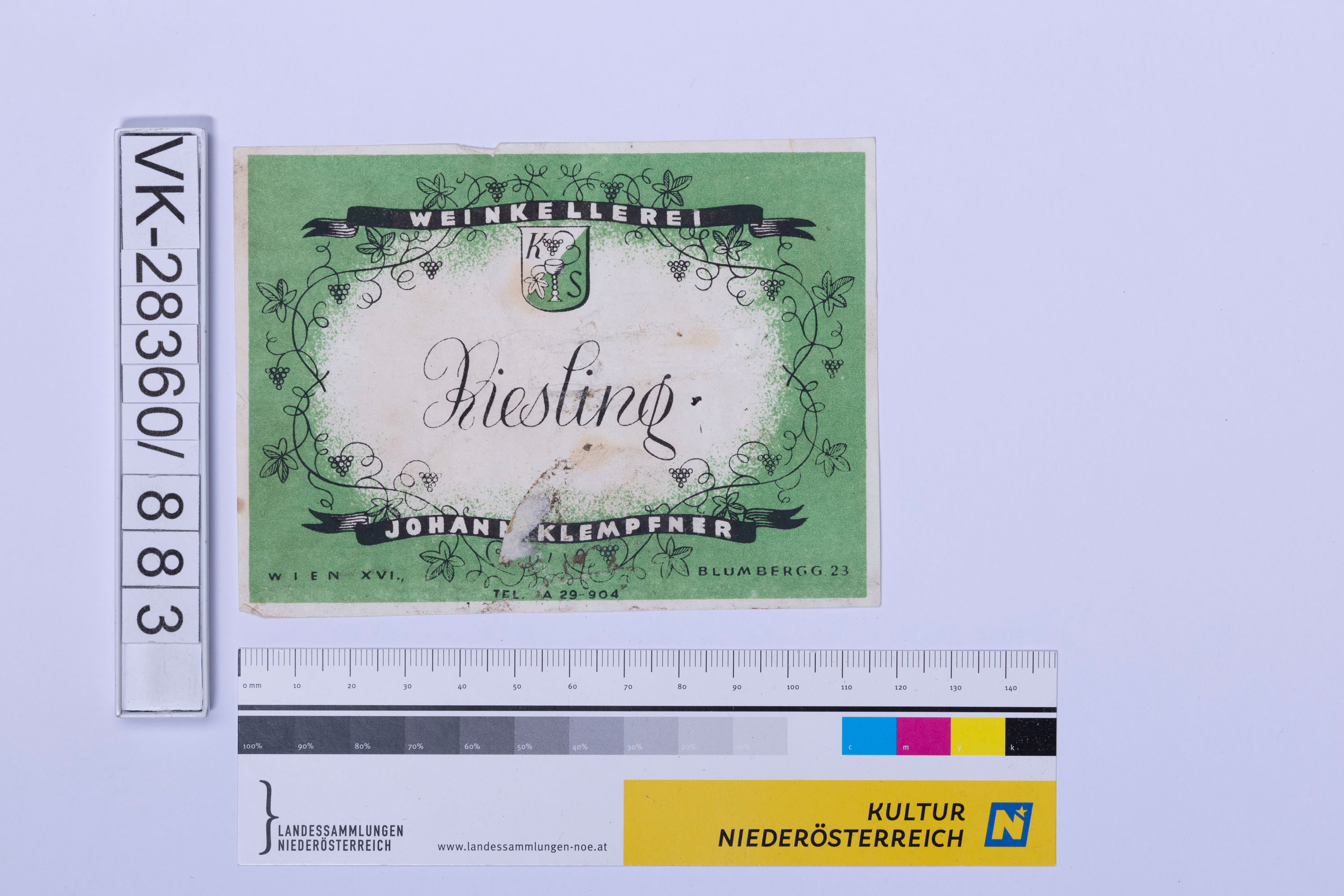 Abgelöstes Weinflaschenetikett aus einer Sammlung von den 1940er bis zu den frühen 1960er Jahren; Weinsorte: "Riesling", Wappendarstellung; Weinbau, Kellerei bzw. Handel: "WEINKELLEREI JOHANN KLEMPFNER WIEN XVI., BLUMBERGG. 23 TEL. A 29-904"