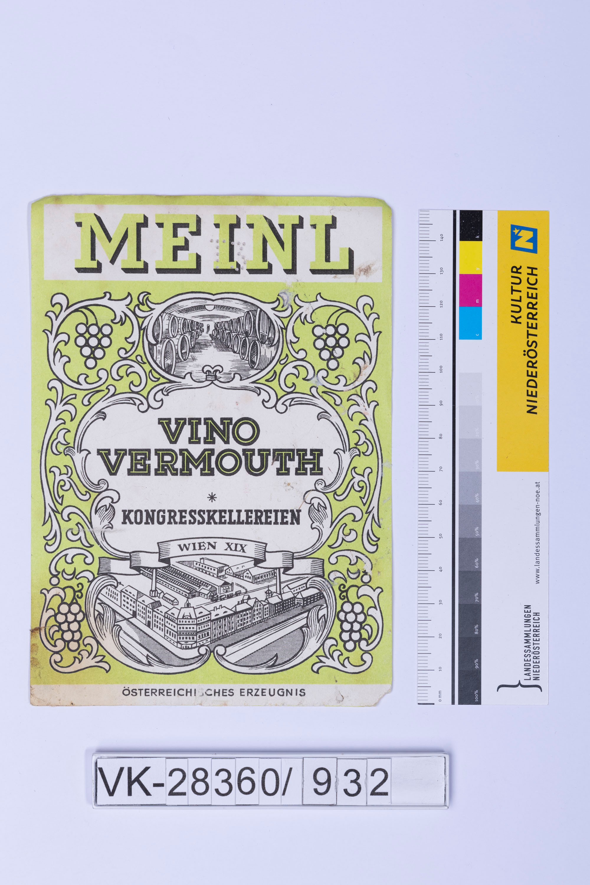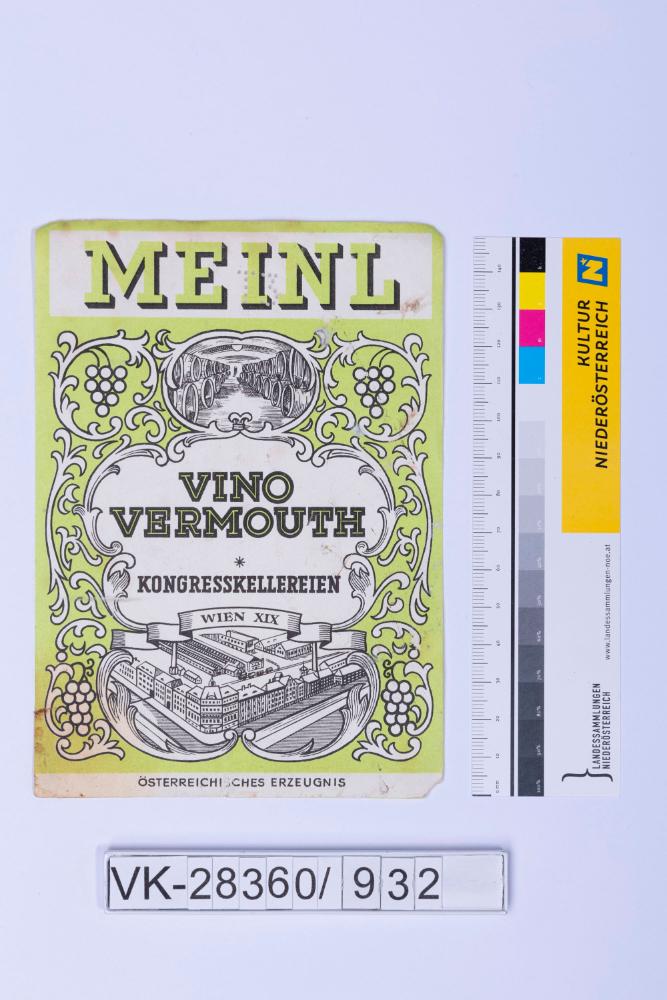 Abgelöstes Weinflaschenetikett aus einer Sammlung von den 1940er bis zu den frühen 1960er Jahren; Weinsorte: "VINO VERMOUTH", Darstellung eines Betriebes mit Weinfässern; Weinbau, Kellerei bzw. Handel: "KONGRESSKELLEREIEN WIEN XIX"