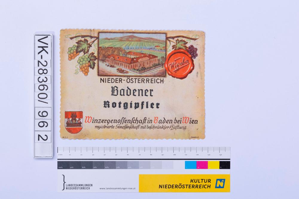 Abgelöstes Weinflaschenetikett aus einer Sammlung von den 1940er bis zu den frühen 1960er Jahren; Weinsorte: "NIEDER-ÖSTERREICH Badener Rotgipfler", Darstellung von Betrieb, Siegel und Weinreben; Weinbau, Kellerei bzw. Handel: "Winzergenossenschaft in Baden bei Wien"