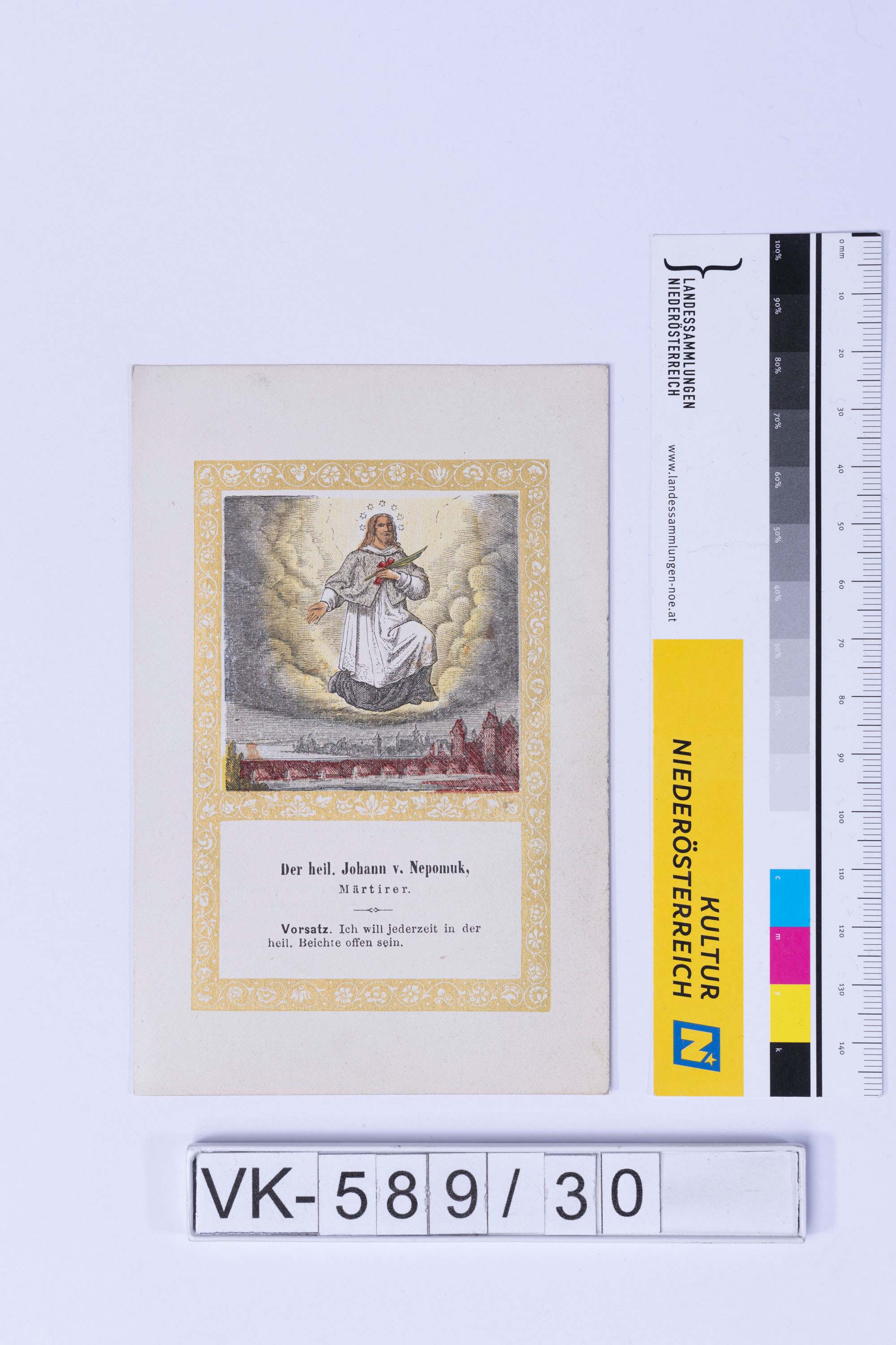 Heiligendarstellung (Johannes von Nepomuk in liturgischem Gewand) mit Kreuz und Märtyrerpalme, städtische Szenerie, Vorsatz