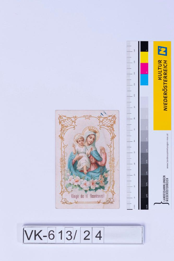 Vorderseite: Heiligendarstellung (Maria) mit Kind, Beschriftung: "Königin des hl. Rosenkranzes!"; Rückseite: Ablassgebet