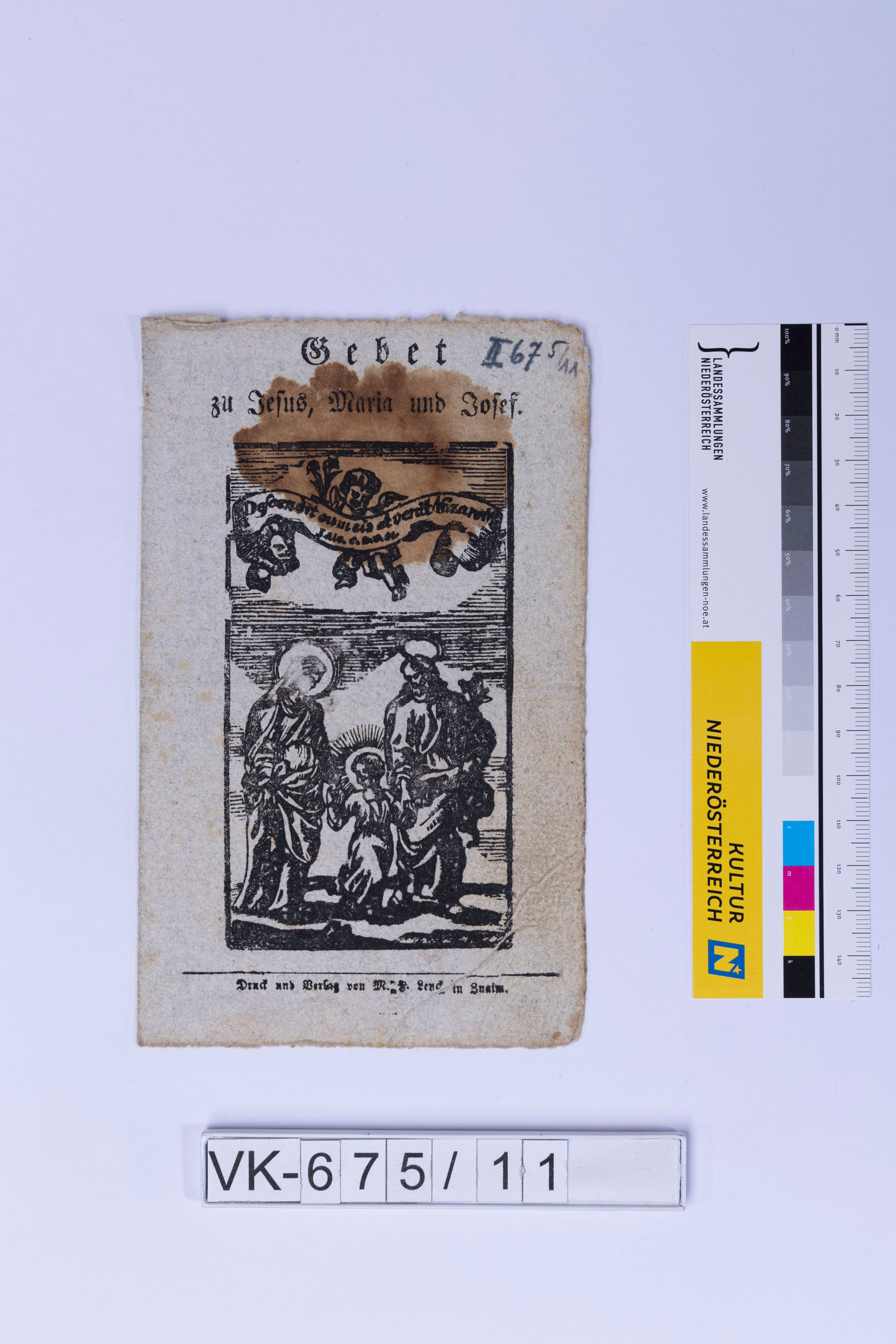 Gebetsheftchen; Vorderseite: "Gebet zu Jesus, Maria und Josef", Abbildung der Heiligen Familie; Innen- und Rückseite: Anrufung, Gebet