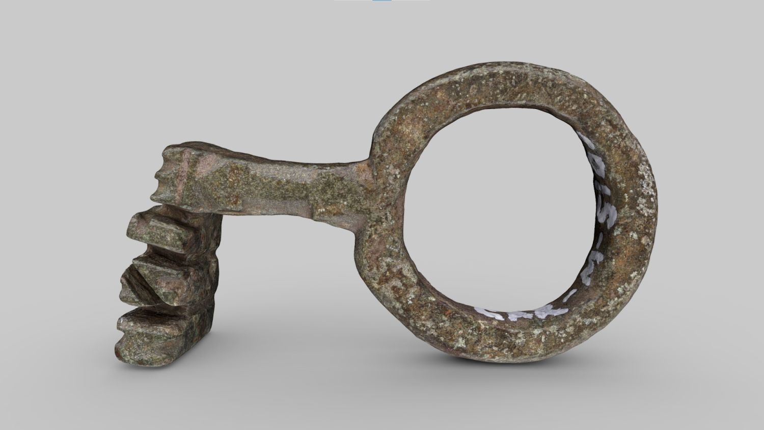 Ringschlüssel mit unterständigen Zinken und im Querschnitt rechteckigem Schaft. Auf der Griffvorderseite befindet sich eine Verzierung in Form eines Pfeils mit einem Blatt an beiden Enden, darunter eine vertiefte Kerbenmusterung. Der einfach abgewinkelte Bart besteht aus zwei im Querschnitt dreieckigen und zwei im Querschnitt rechteckigen Zinken.