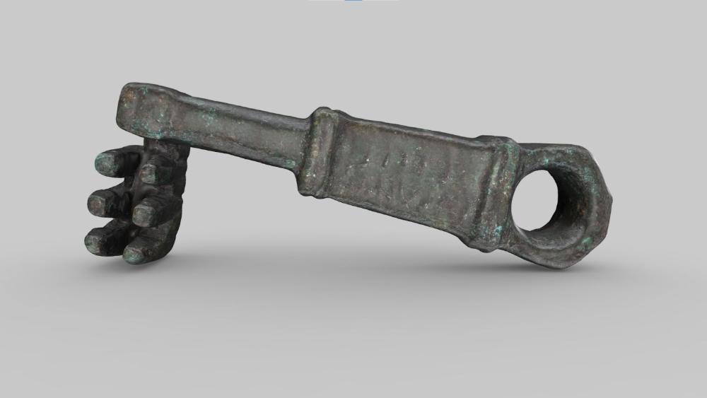 Schiebeschlüssel mit unterständigen Zinken und im Querschnitt rechteckigem Schaft mit abgerundeten Kanten. An der Griffvorderseite ist eine zweizeilige Inschrift des Herstellers: LVCANVS FECIT. Die Ecken der Dreieckform am Umschweif sind gerundet. Die Ringöse und der Schaft sind stark und durch Stege vom Griff abgesetzt. Am Ringende befindet sich ein fragmentierter Fortsatz. An der Oberseite des unteren Schaftendes befindet sich eine vertiefte sternförmige Musterung. Der einfach abgewinkelte Bart besteht aus sechs im Querschnitt rechteckigen Zinken.