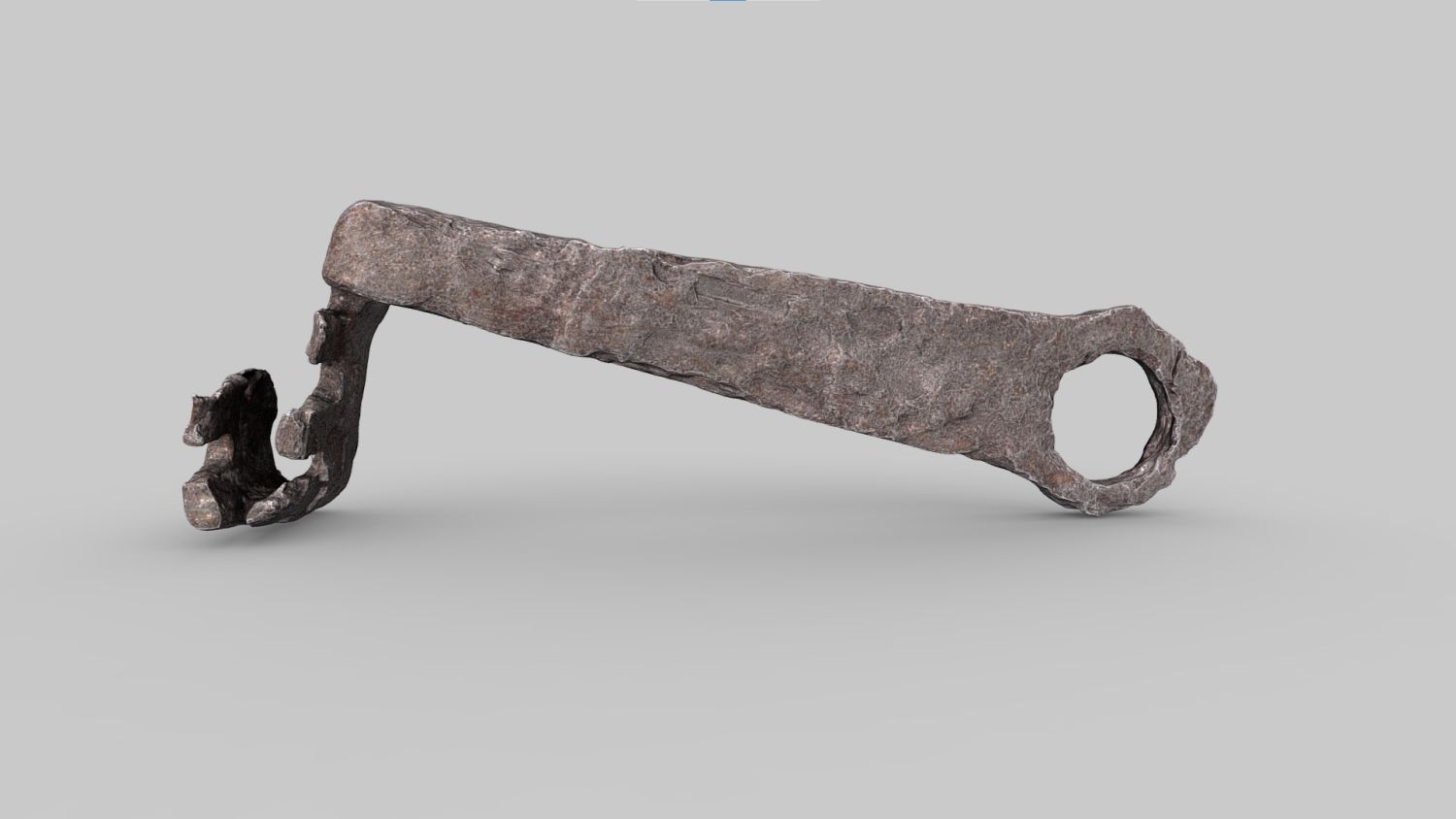 Schiebeschlüssel mit unterständigen Zinken. Der Bartsteg geht fließend in einen Schaft mit rechteckigem Querschnitt über. Der doppelt abgewinkelte, fragmentierte Bart besteht aus fünf im Querschnitt rechteckigen Zinken.