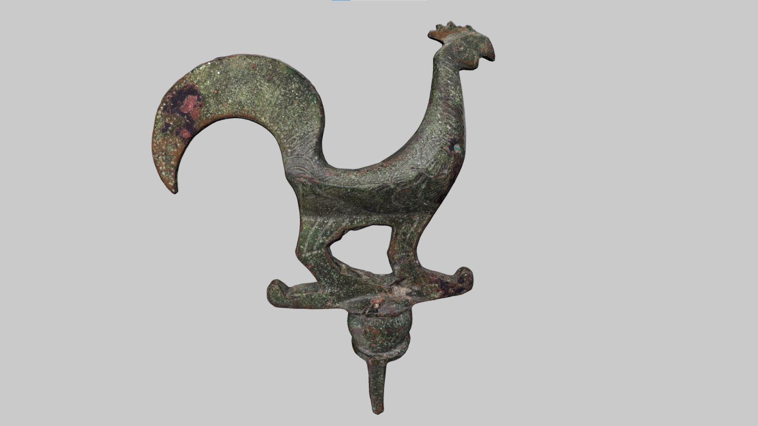 Der Hahn steht auf einer Standplatte und einer Kugel. Das Gefieder und die Augen sind mit feiner Gravur angedeutet. Der sichelförmige Schwanz und die gestreckten Beine sind flach, der Körper ist plastisch ausgearbeitet. Der Ansatz ist fragmentarisch erhalten.