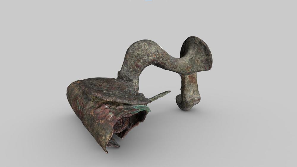 Technische Detailsdreigliedrige Fibel; die Hülse ist aus einem anderen Material (Bronze-Zinn Legierung), der Körper ist aus stark bleihaltiger Bronze-Zinn Legierung hergestellt