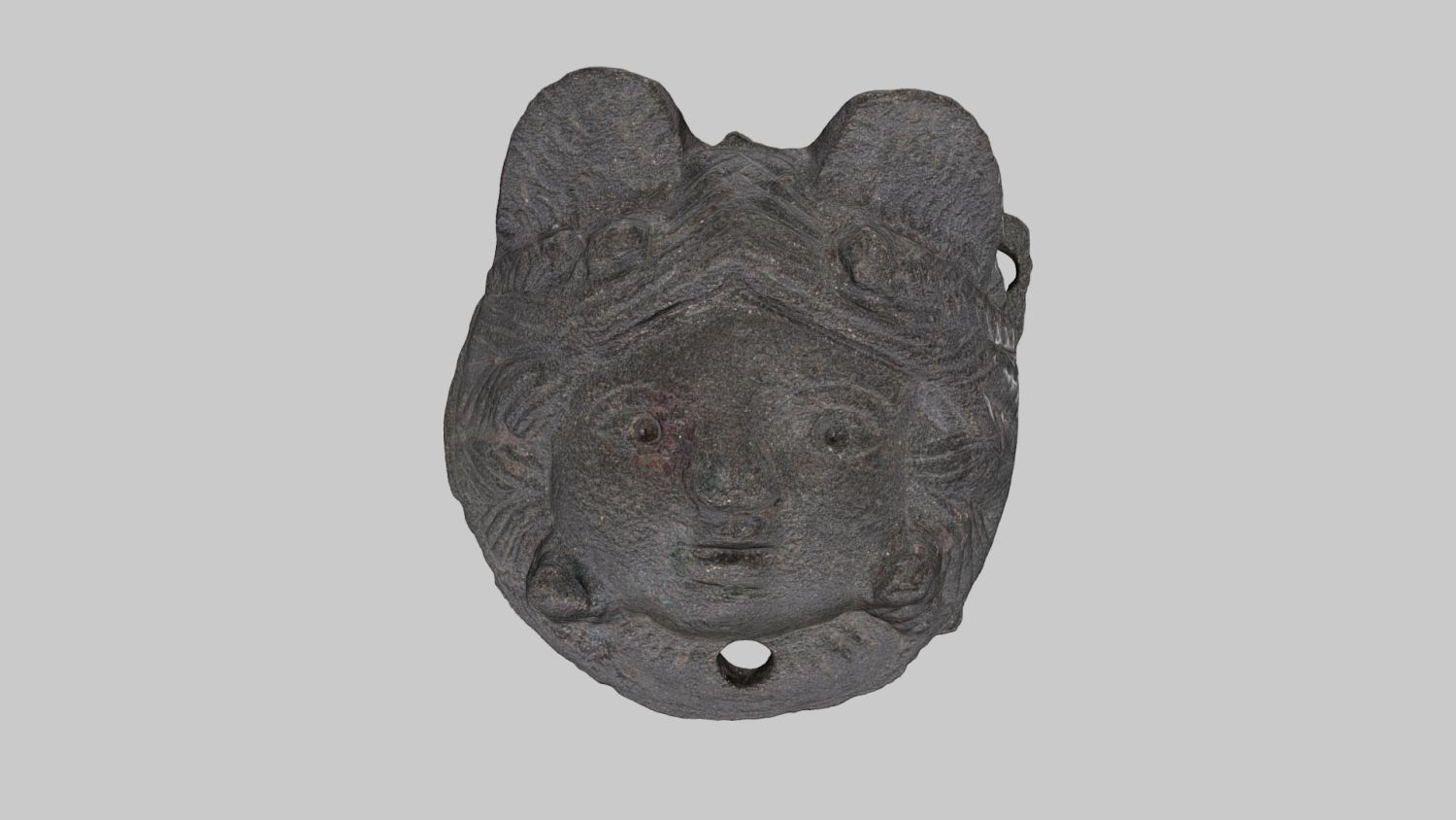Runde Beschlagplatte mit zwei Nietlöchern und einer Befestigungsöse. Das Medusenhaupt ist mit zwei Flügeln über der Stirn und vier stilisierten Schlangenköpfen, die seitlich emporragen, abgebildet. Das Haar und das Flügelpaar sind durch Kerben angedeutet. Auf der Rückseite befinden sich noch Eisenreste vom Ansatz.
