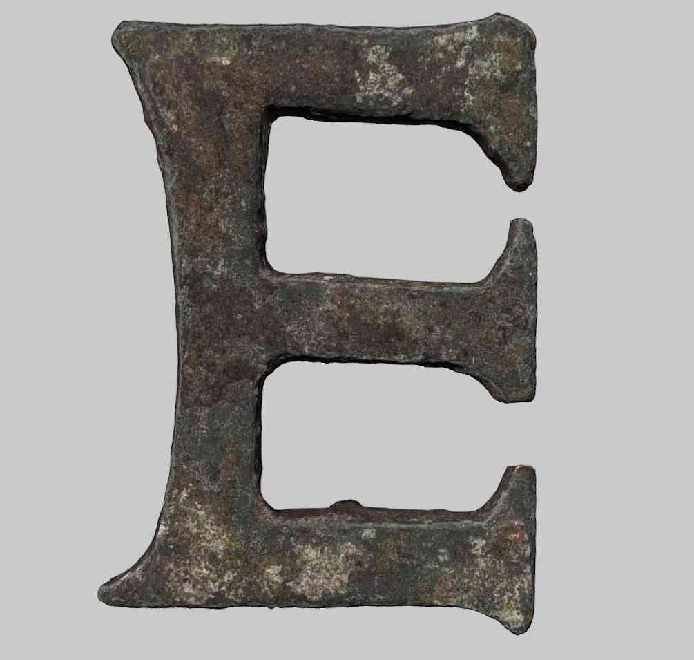 Der Beschlag eines ursprünglich schmalen Gürtels besitzt die Form des Buchstabens „E“. Auf der flachen Rückseite befinden sich zwei kurze, kopflose Nietstifte, mit denen er ehemals auf dem Leder befestigt war. Die Buchstabenbeschläge waren so angeordnet, dass sich ein Sinnspruch ergab: UTERE FELIX – „zum glücklichen Gebrauch“ bzw. „Benutze es als Glückliche/r“ oder „Trage es glücklich“.