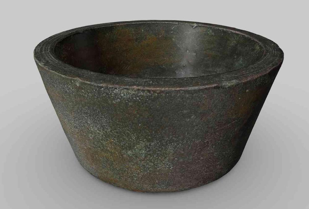 Rundes, konisch zulaufendes Schälchen mit hohem Rand. Der flache Boden ist mehrmals profiliert, die innere Mitte ist durch einen, vertieften Kreis angedeutet. Die äußere Bodenseite ist mehrfach mit eingeritzten Linien versehen.