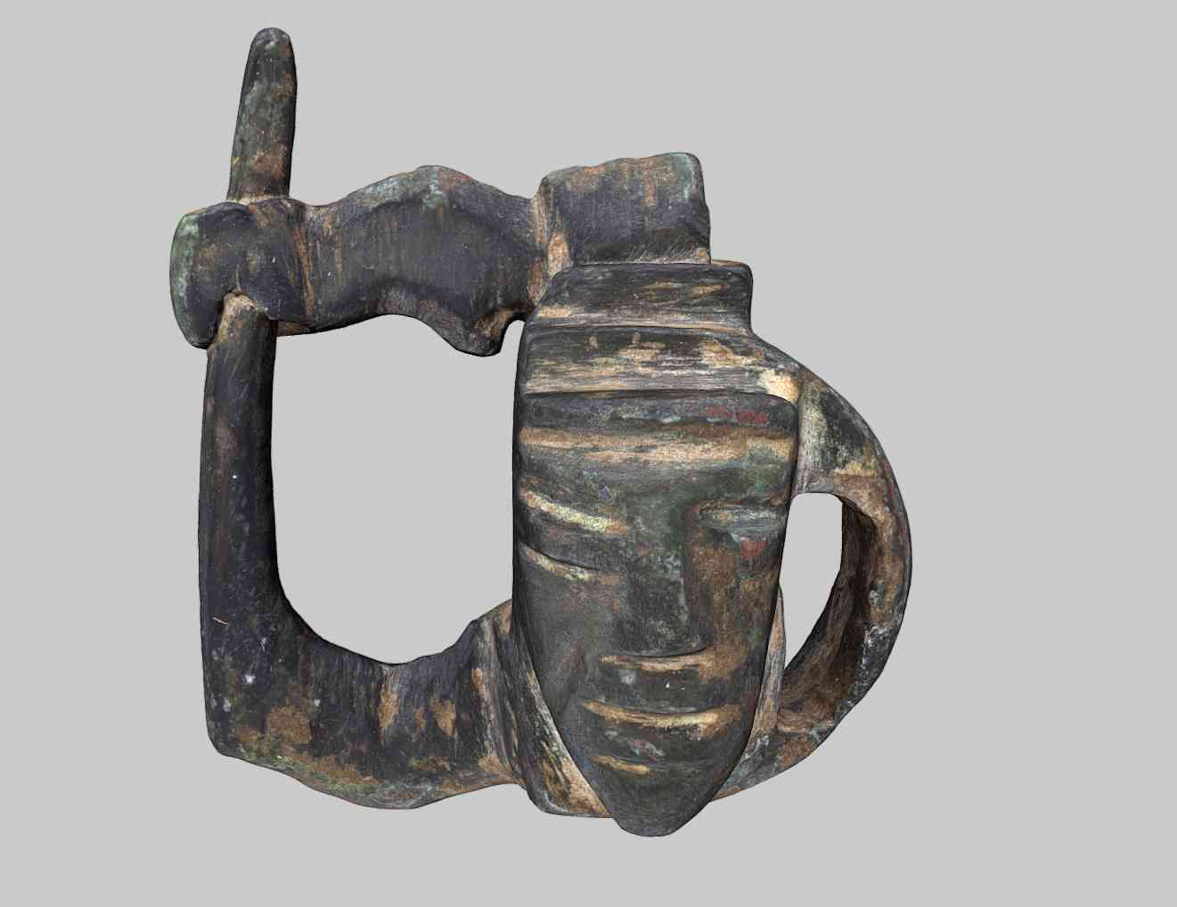 Bei dem Stück handelt es sich um ein bronzenes Vorhängeschloss; die Vorderseite des Schlossmantels zeigt ein plastisch ausgearbeitetes, langgezogenes, stilisiertes Gesicht (sog. Maske) mit strengem Ausdruck. Links der Maske ist der Mantel durch eine längsovale Schlüssellochöffnung durchbrochen, rechts schließt sich der Bügel in der Form eines abstrahiert gestalteten, abgewinkelten Armes nahtlos an ihn an. Der Riegelkopf ist noch im Schloss eingesetzt, der gleich dem Bügel abstrakt-armförmige Riegelschaft ist vollständig erhalten und hält das Vorhängeschloss verschlossen. Die Rückseite fehlt hingegen gänzlich, ebenso wie der eigentliche Schließmechanismus. Charakteristisch ist, dass Schlösser dieser Art durchwegs in einer Art „keltisierendem“ Stil sehr ähnlich gearbeitet, zugleich jedoch individuell ausgestaltet sind – ein Hinweis darauf, dass sie offenbar nicht in einer standardisierten Serienproduktion gefertigt wurden.
