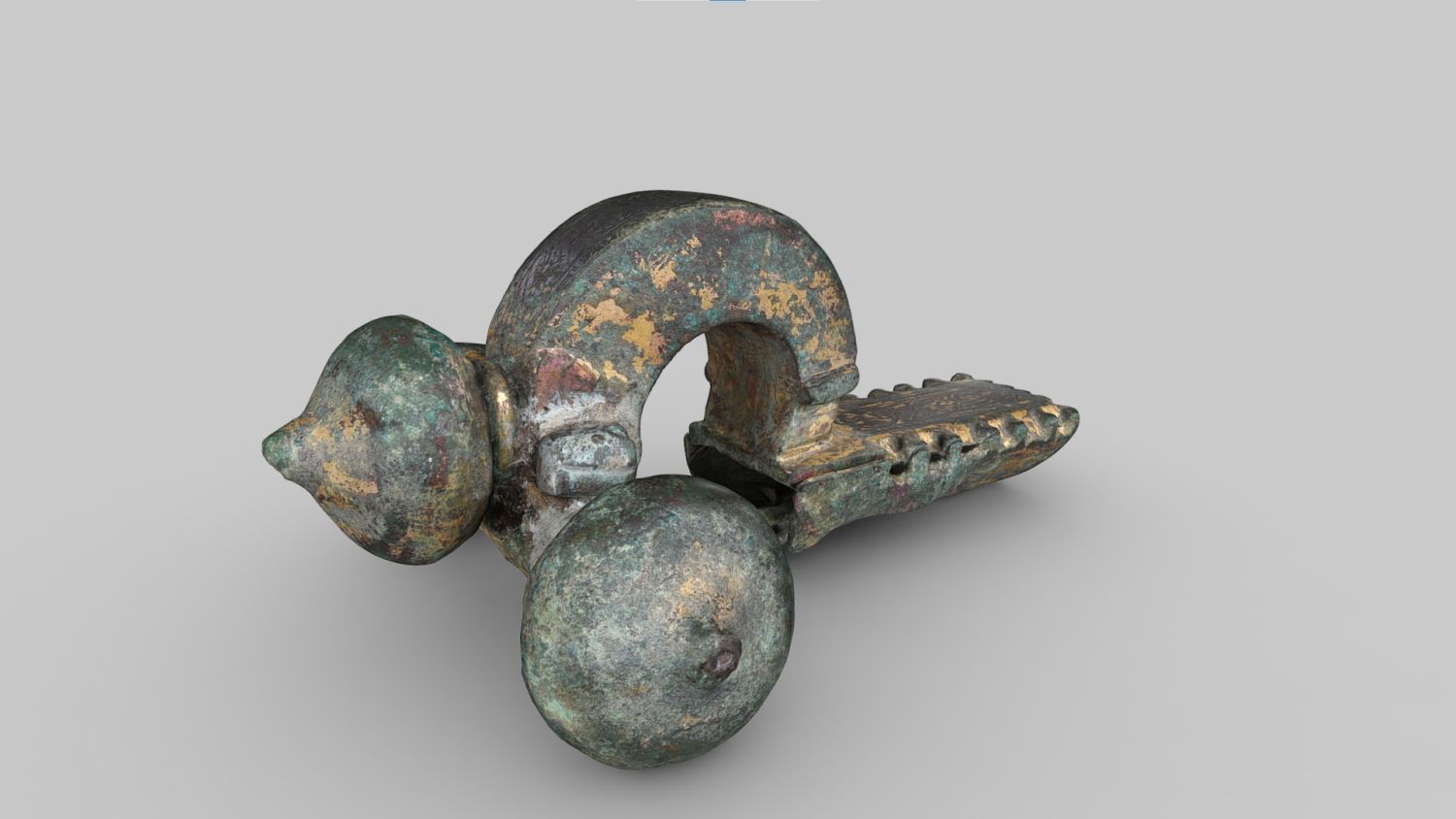 Die Fibel besteht aus Bronzeblech, das mit einem Goldüberzug versehen war, von dem größere Flächen am fußseitigen Bügelende und auf der Fußoberseite erhalten sind. Der Querarm, die drei Zwiebelknöpfe und der Bügel sind hohl. Der Scharnierarm ist im Querschnitt sechseckig, trägt zu beiden Seiten des Bügels Aufsätze und endet mit großen Zwiebelknöpfen. Die Knöpfe sitzen auf einer gerillten Basisscheibe. Der Bügel ist im Querschnitt trapezförmig. Die Bügeloberseite ist in Niellotechnik verziert. Diese Verzierung zeigt eine männliche Porträtbüste, mit einem Mantel bekleidet, in einem Medaillon sowie verschiedene geometrische Muster. Die Nielloverzierung mit verschiedenen geometrischen Mustern ziert auch die Fußoberseite. Die parallelseitigen Fußränder sind mit je drei plastischen Voluten verziert. Der Röhrenfuß öffnet sich mit einem länglichen Schlitz nach der rechten Seite. Die Nadel ist ebenfalls erhalten.