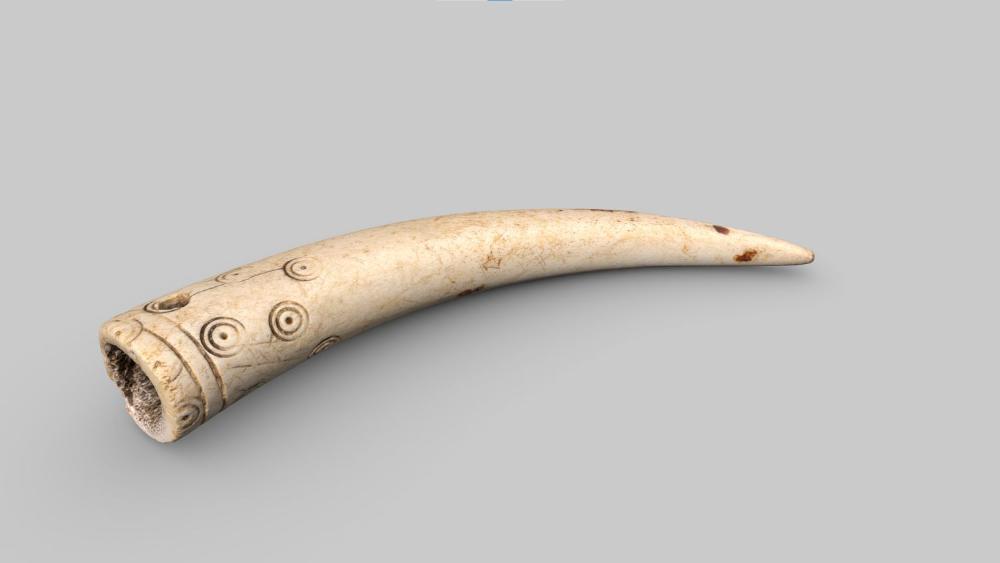 Die Geweihspitze mit Bohrloch am breiten Ende und Kreisaugendekor. Am spitz zulaufenden Ende befindet sich eine Eintiefung, die wahrscheinlich durch Gebrauch entstanden ist.