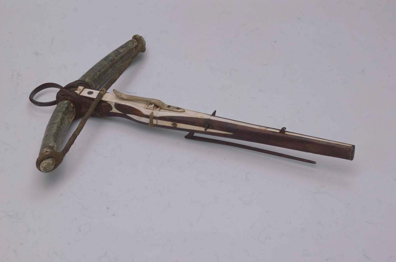 Armbrust mit Hornbogen und Einlegearbeiten aus Bein.